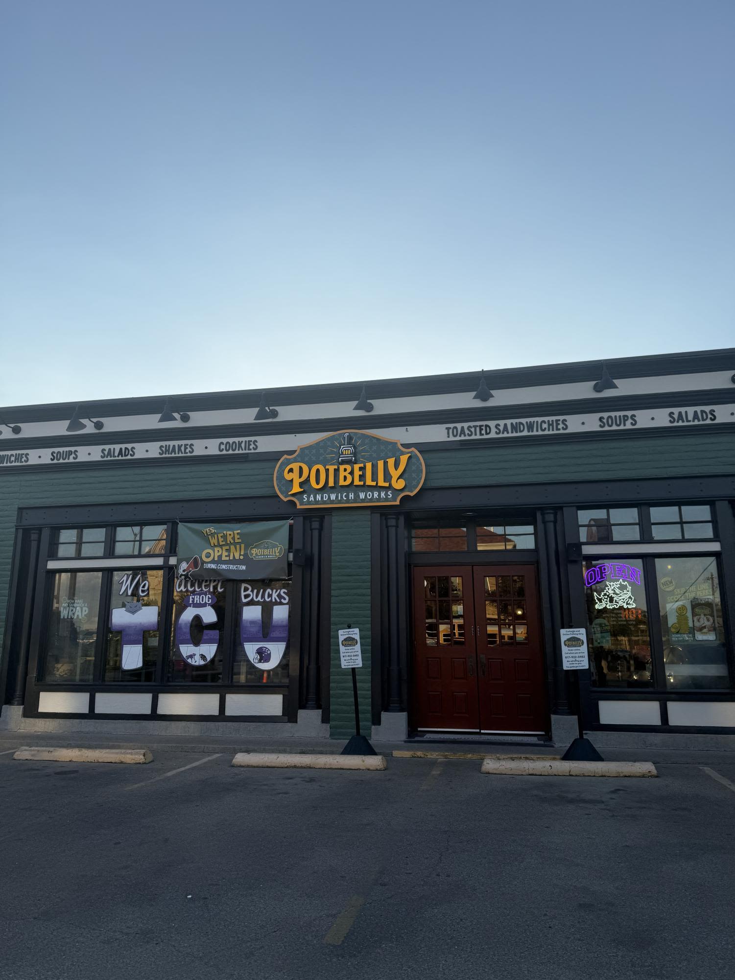 Potbelly Sandwich Shop is located off of University Drive, and offers toasted sandwiches, soups, salads, shakes and cookies.