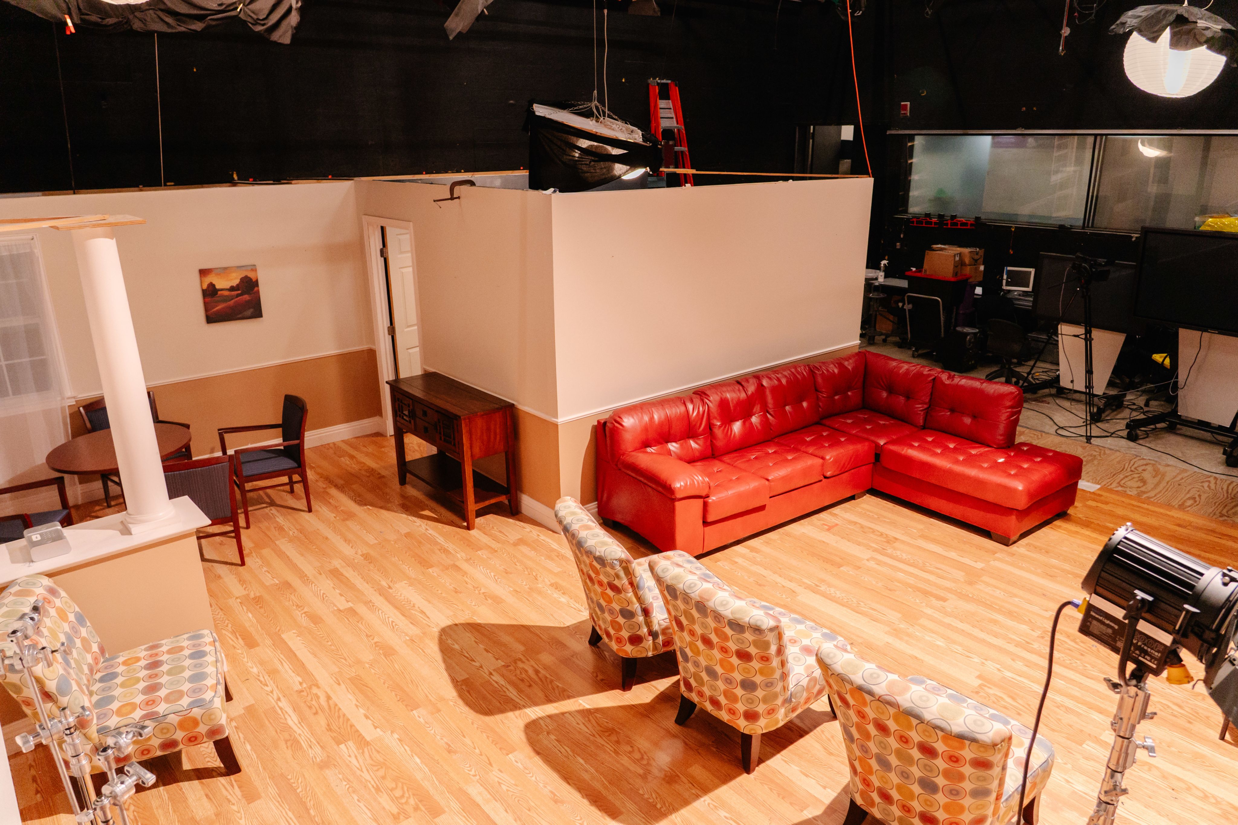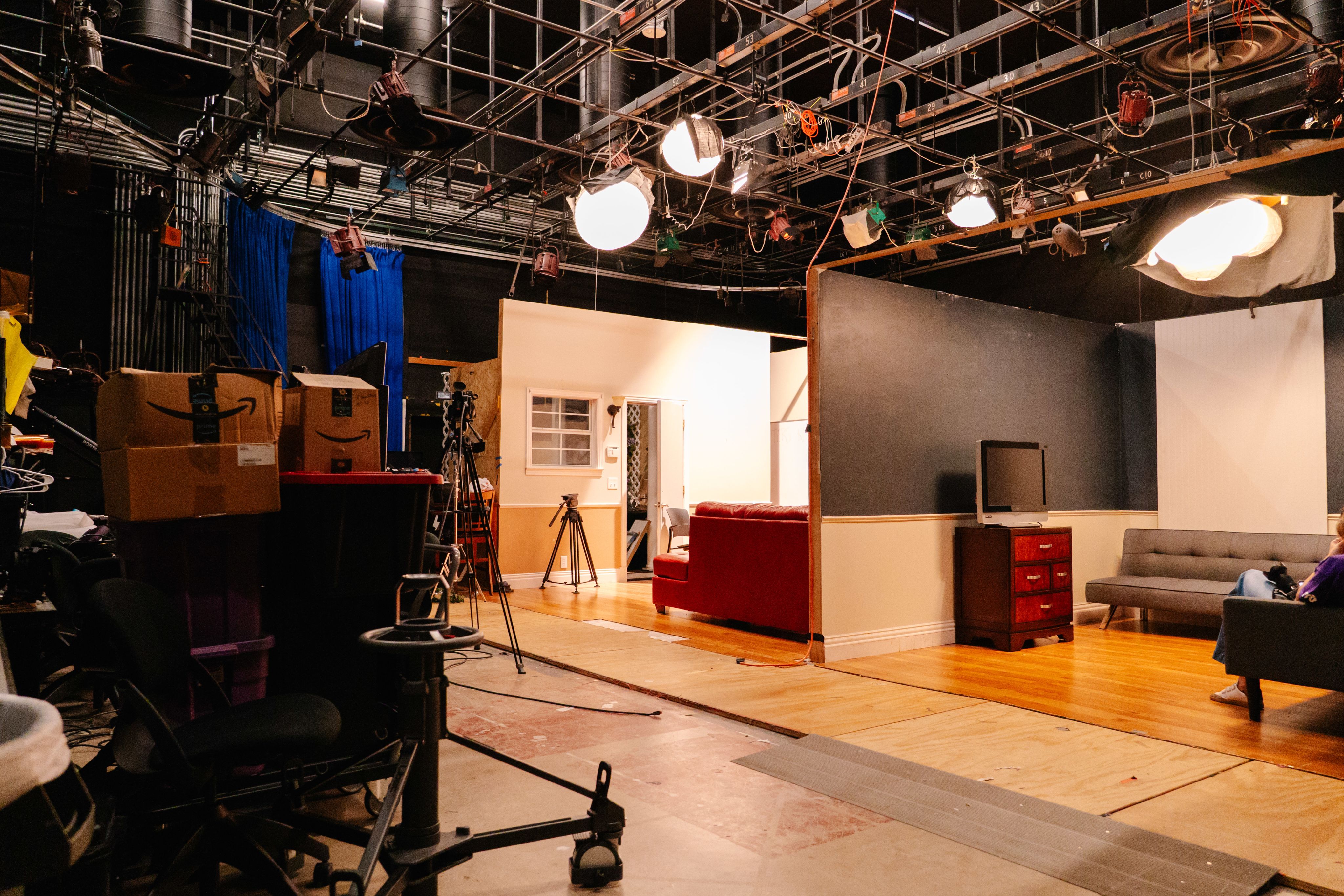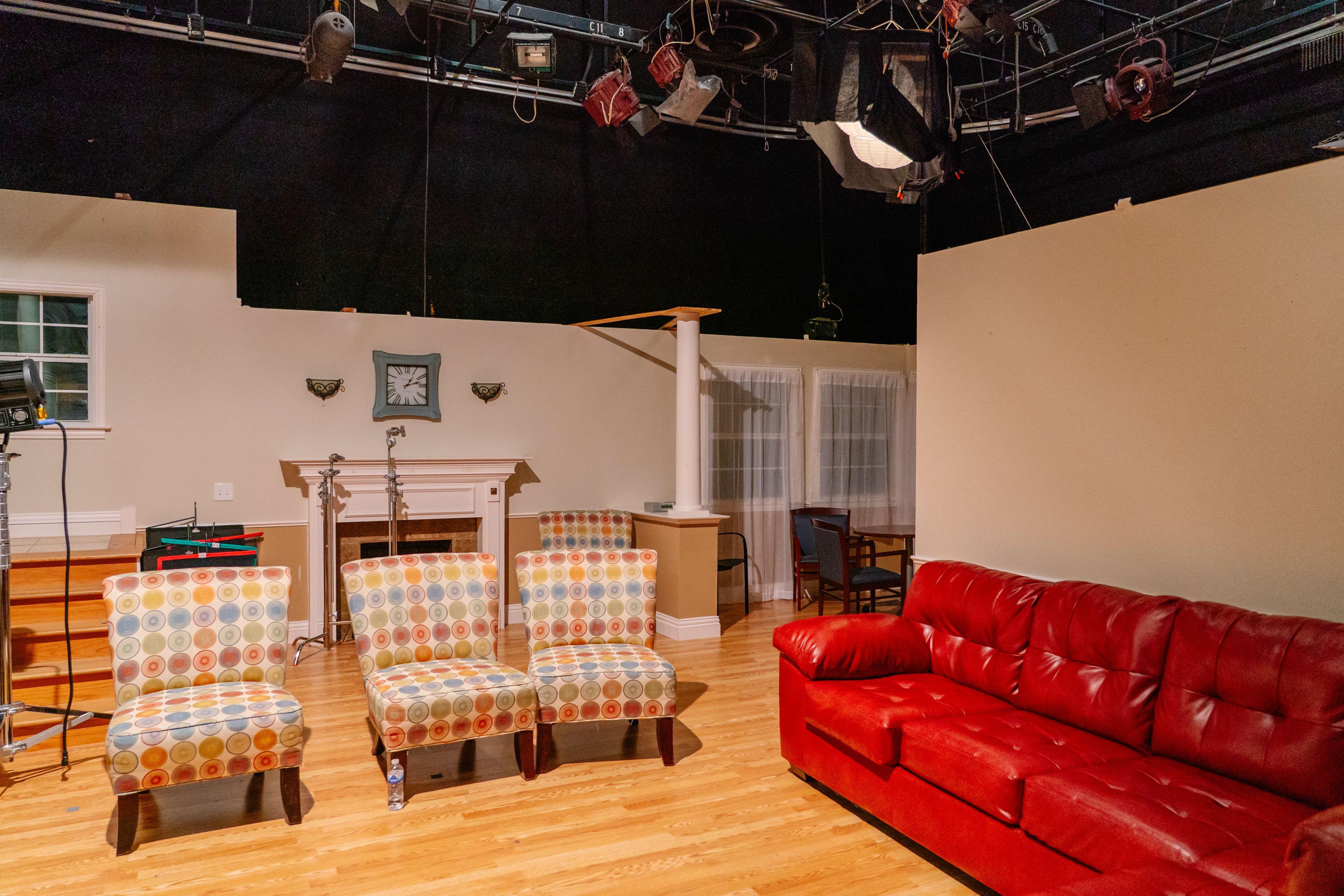 Built entirely by TCU production students, this custom house set transforms the studio into a lifelike home environment. It's perfect for learning set design, lighting, and scene blocking.
