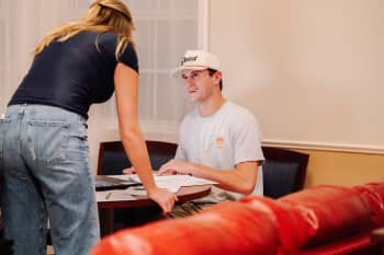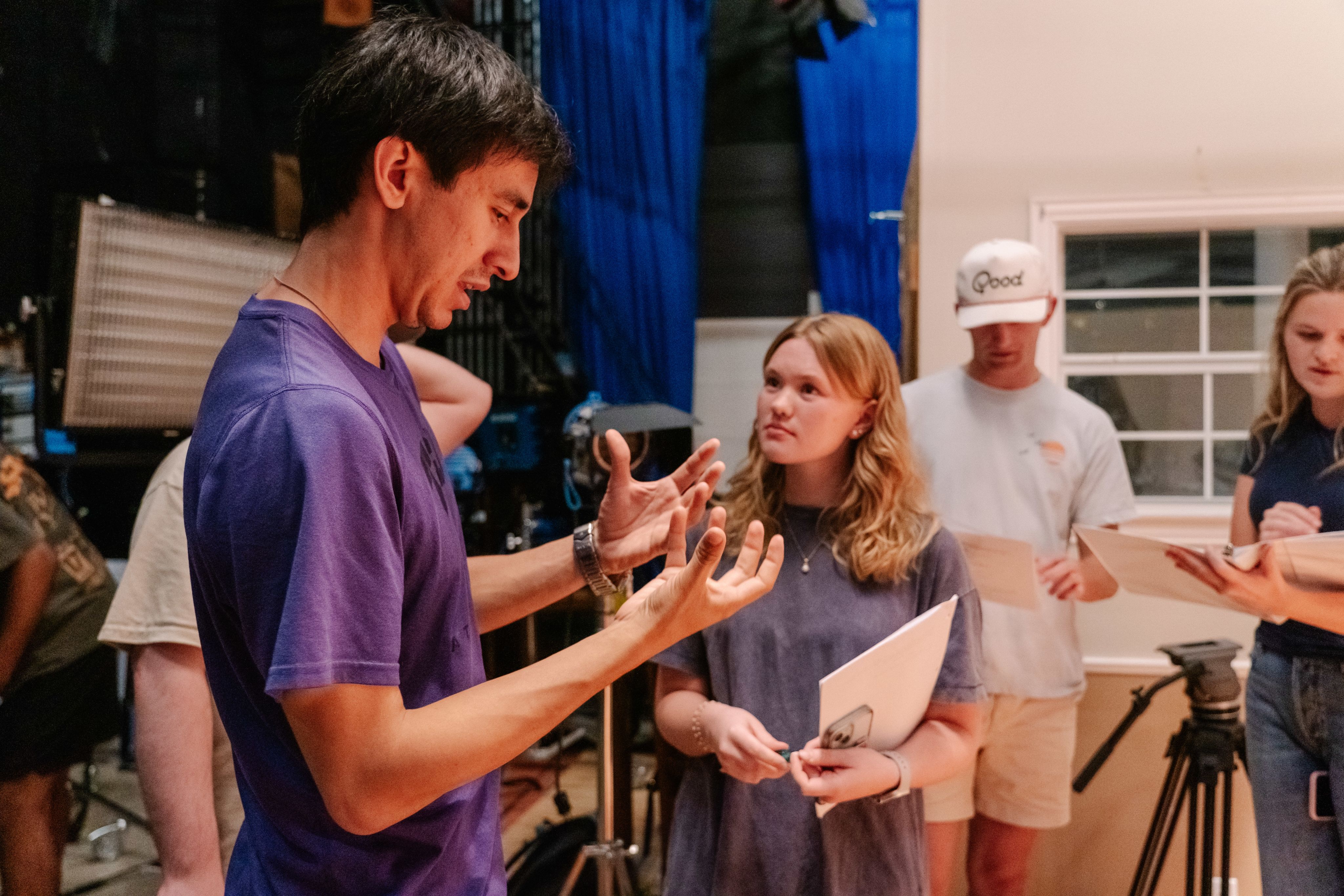 Freddy Ornelas, a senior majoring in FTDM with a minor in Entrepreneurship, serves as the cinematographer for this production. He speaks with McKay Trulove, junior FTDM major with a minor in political science, who is the director of this semester's short film. Students choose their production roles based on personal interest, with selections made on a first-come, first-served basis.