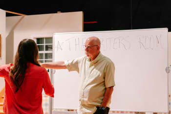 Production professor Chuck LaMendola oversees the students as they plan their production. This class exemplifies how upper-division courses are student-led and staff-advised.