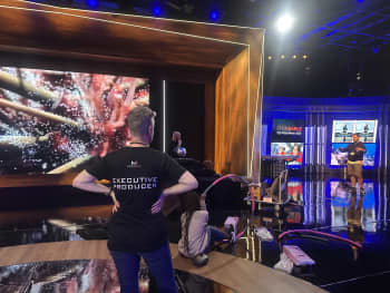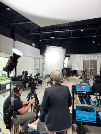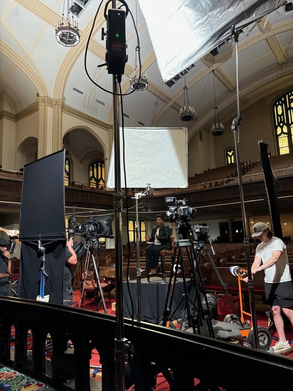 When I walked in, the studio was already humming with quiet activity. A few crew members were checking the lights, their faces glowing under the soft white bulbs. Someone crouched at the podium, wiping it down with glass cleaner until it gleamed under the stage lights. Nearby, a dolly rolled in, stacked with Amazon boxes waist high. Towers of cardboard hinted at the chaos behind the order of filmmaking.