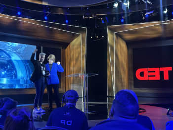 Darr was in the middle of it all, directing traffic. She opened boxes, pulling out props and describing what she saw in her mind’s eye. The tables, she noticed, were wrong. Round tops but square bases, nothing like the sleek, circular ones from Earle’s original TED stage. “We can fix that,” she said, half to herself, and handed a crew member a box of hula hoops. The idea was to use them to round out the tables’ silhouettes. It was ingenious, except the hoops were too big.