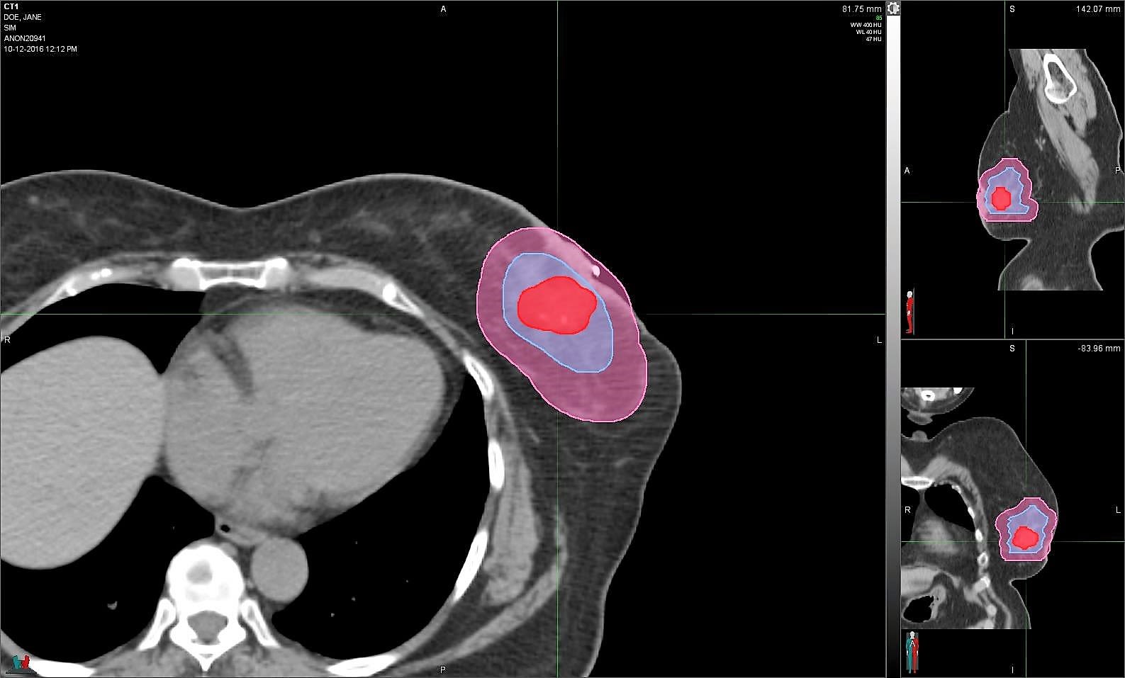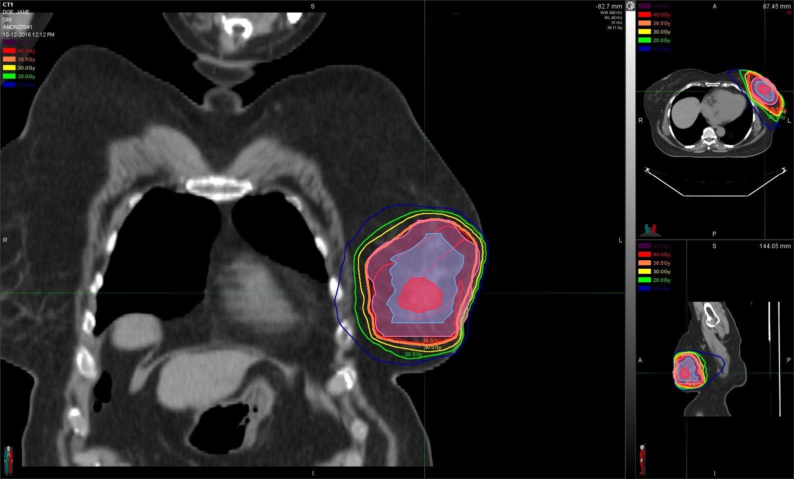 The colored portions of the scan represent the calculated area that gets radiated after breast conservation or lumpectomy. (Photos courtesy of Beth Anglin)