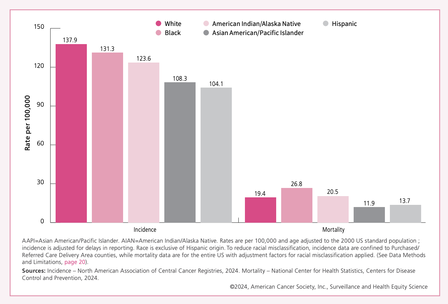 There are racial and ethnic disparities for breast cancer. Black women are 38% more likely and American Indian/Alaska Native are 6% more likely to die from breast cancer compared to white women, according to American Cancer Society's 2024-2025 Facts & Figures. However, white women are 5% and 10% more likely to have breast cancer compared to black women and American Indian/Alaska native women.