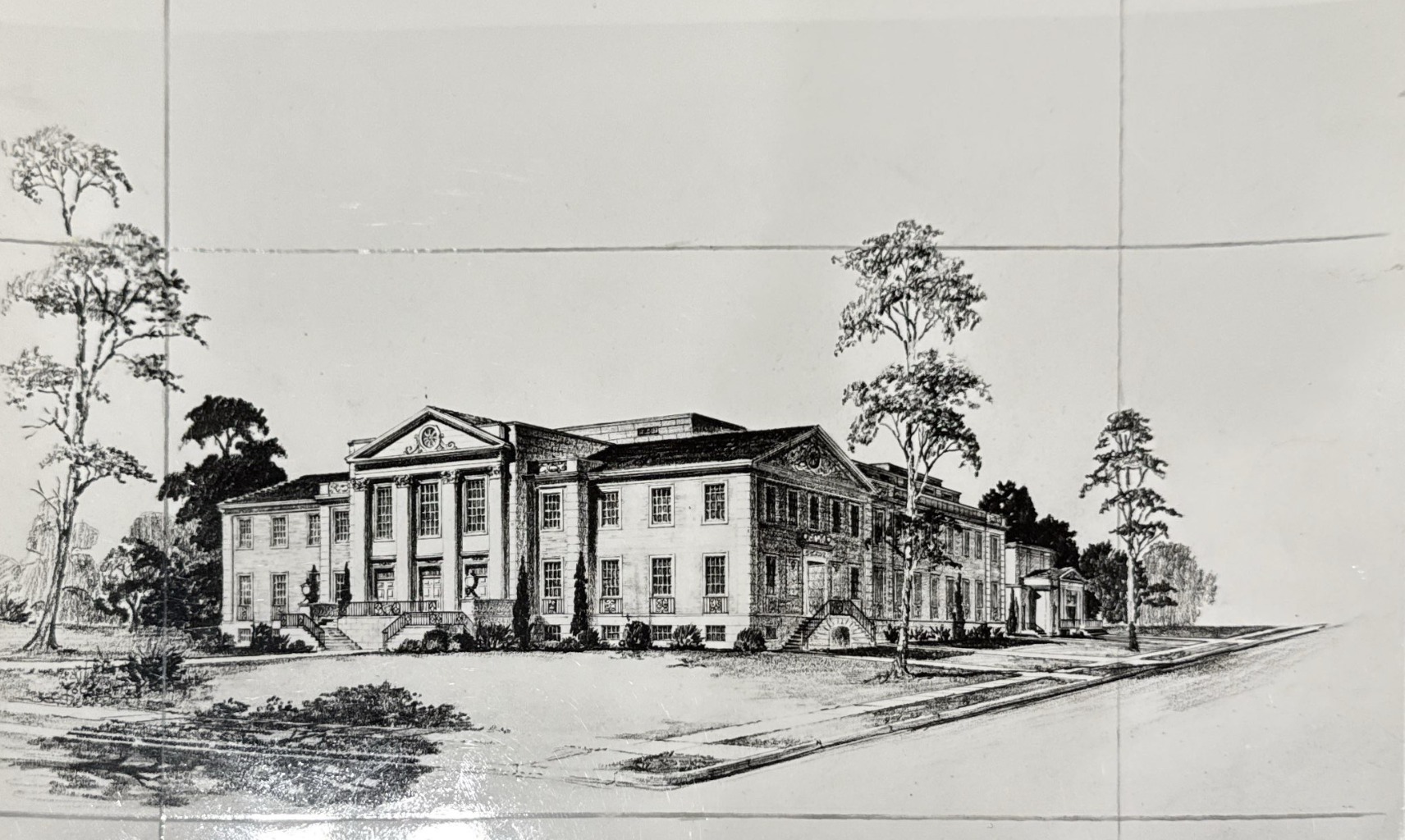 Architectural rendering and drawing of the new Fine Arts Building in 1947/48. (TCU Special Collections)