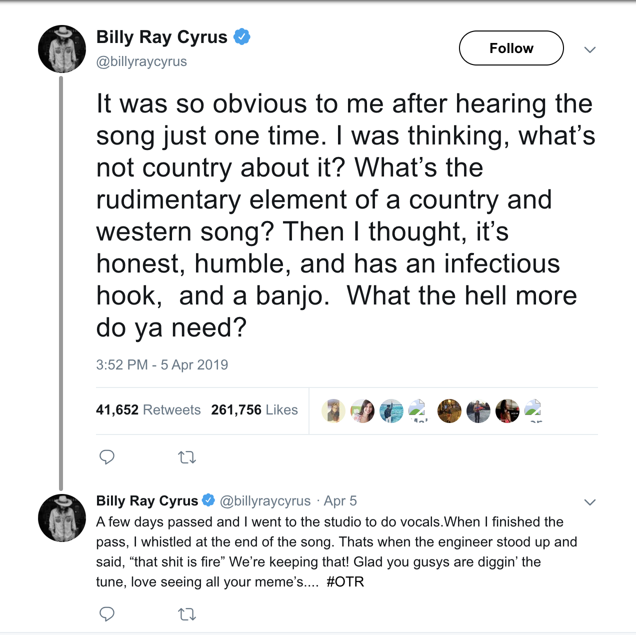 Cyrus, B.R. [@billyraycyrus]. (2019, April 5). It was so obvious to me after hearing the song just one time. I was thinking, what’s not country about [text]. Twitter. Archived at https://web.archive.org/web/20191010180548/https://twitter.com/billyraycyrus/status/1114299875359887360