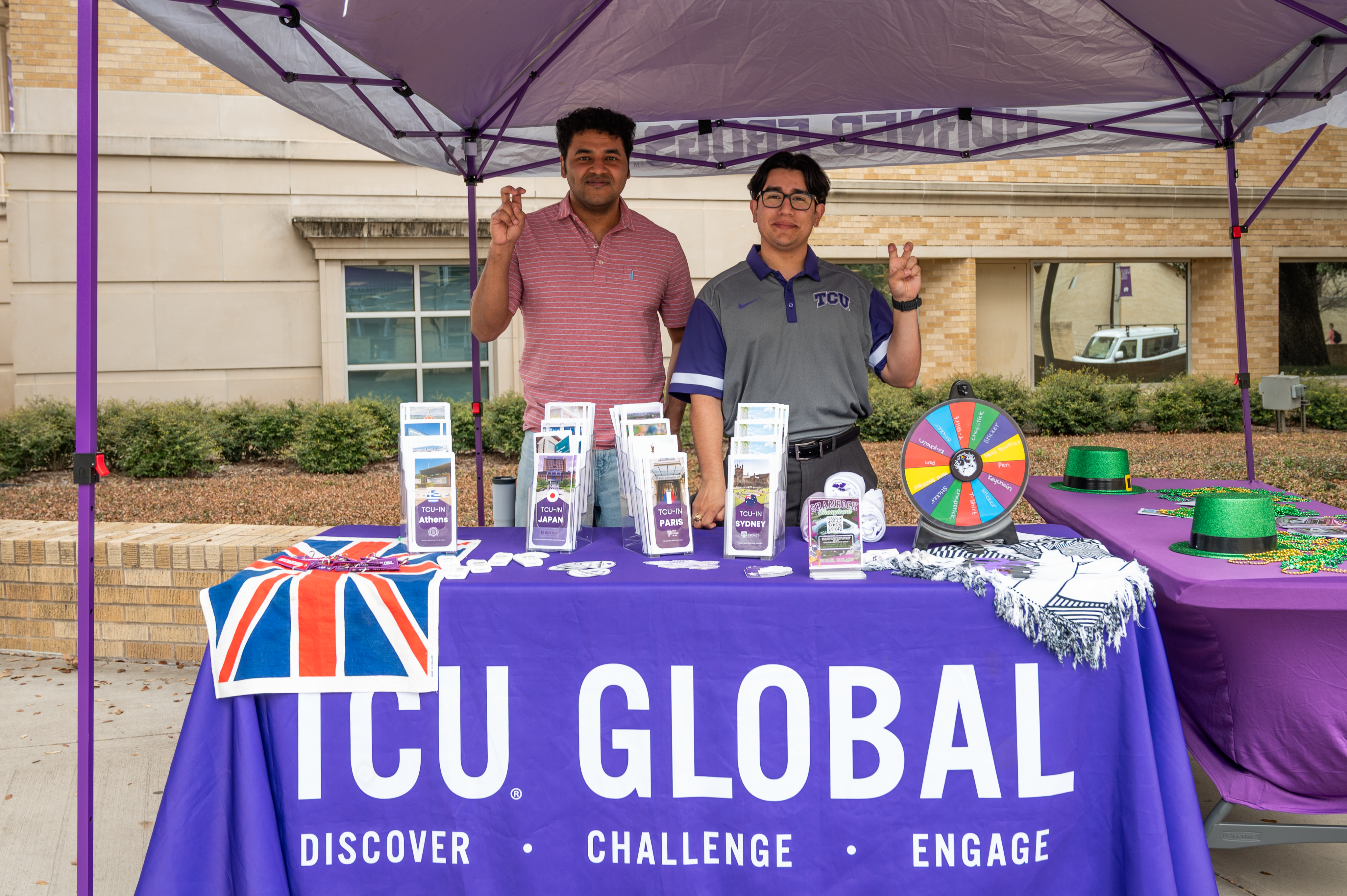 Junior business major Sebastián Galarza and a study abroad advisor table for TCU Global outside the Mary Couts Burnett Library on March 4. (Ella Alexander/TCU 360)