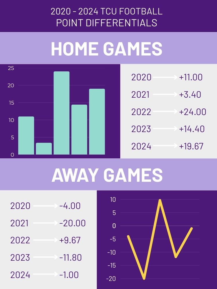 From 2020 to 2024, TCU's average point differential at home was +12.03, while the average point differential for away games was -1.21.