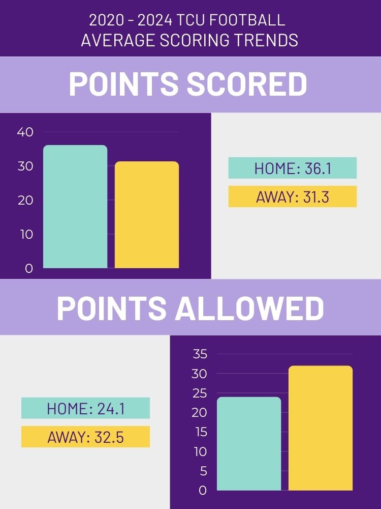 At Amon G. Carter Stadium, the Horned Frogs won by wider margins and played more balanced football on both sides. With the higher win percentages, the point differentials are different, and scoring trends are confirmed. The advantage of home turf at TCU is proven.