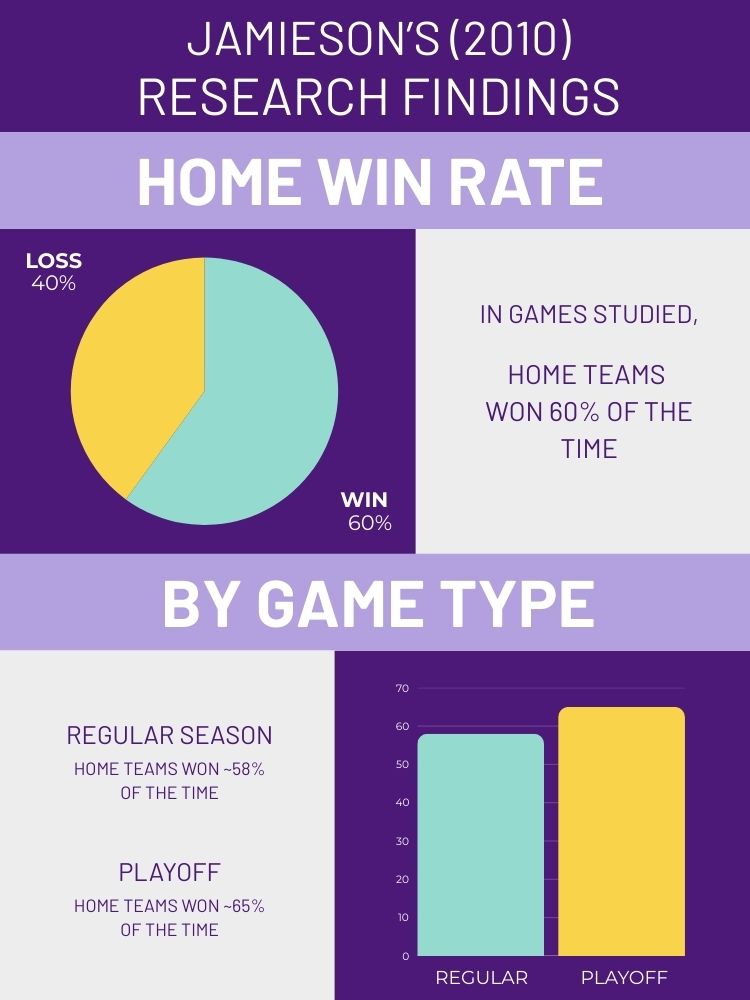 Jamieson's research found a correlation between playing at home and team success, with home teams winning approximately 60% of the time.