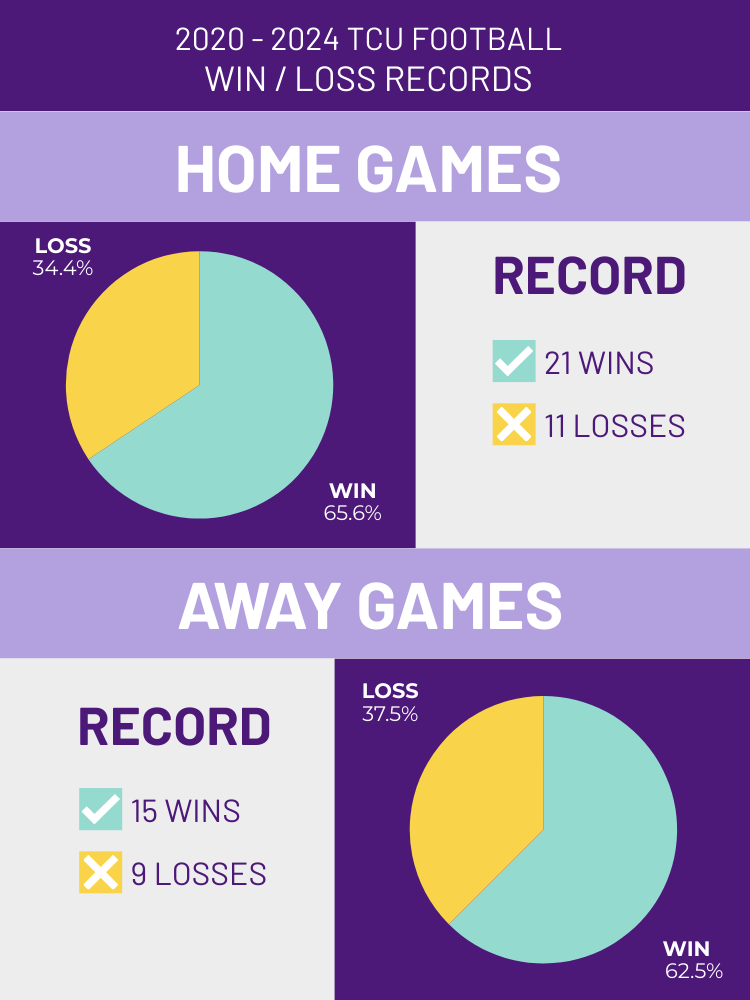In comparison, the Horned Frogs won 15 out of their 24 games while on the road, leaving a 62.5% win rate.