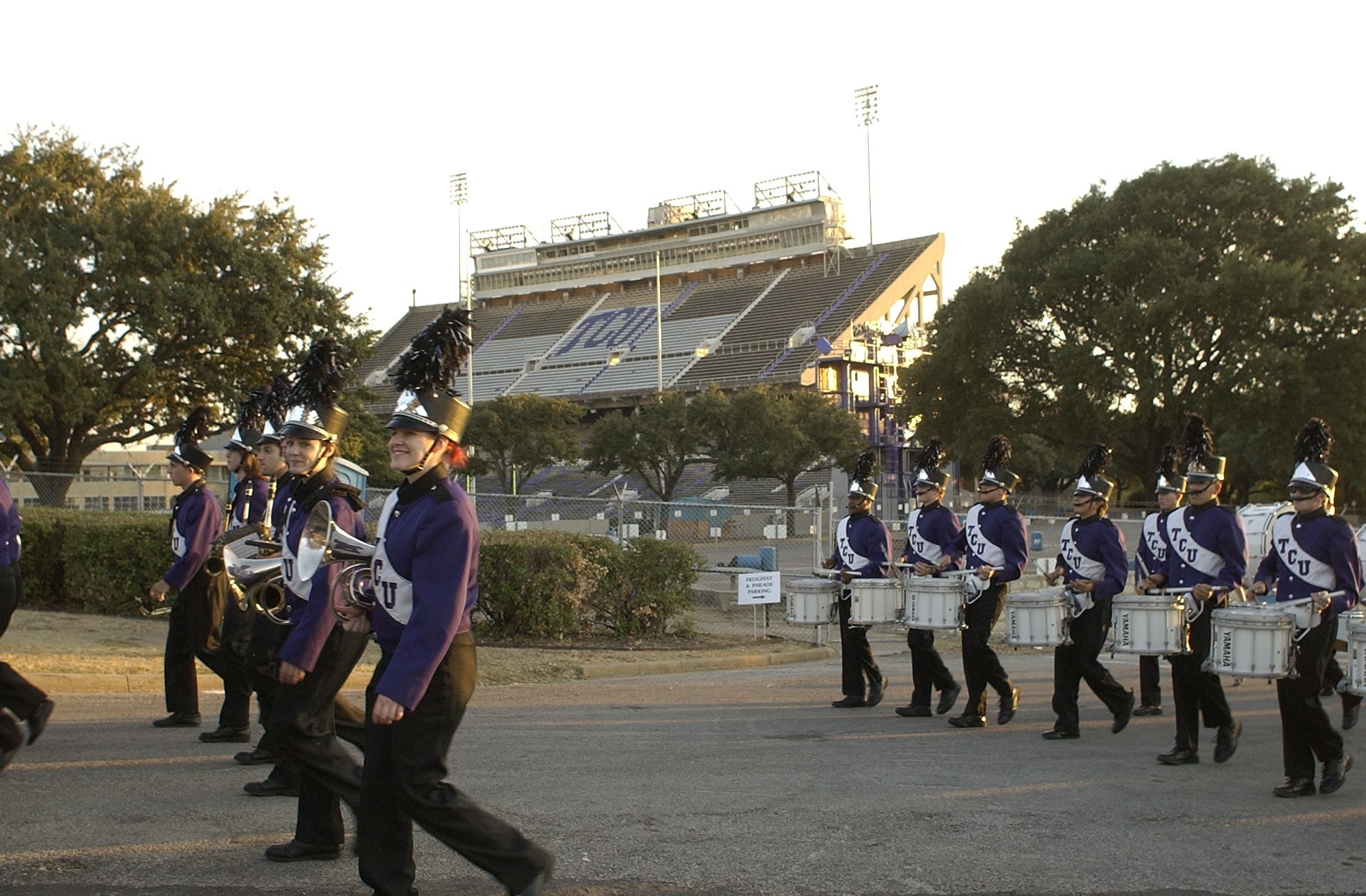 During homecoming weekend this October, University Drive will once again transform into a river of purple and white, the autumn sunlight glinting off trombones and tubas as the familiar strains of the TCU fight song echo between buildings. Elaborately decorated floats will roll past crowds of cheering spectators while costumed student organizations, high-stepping band members and beaming university dignitaries wave to families lining the route.