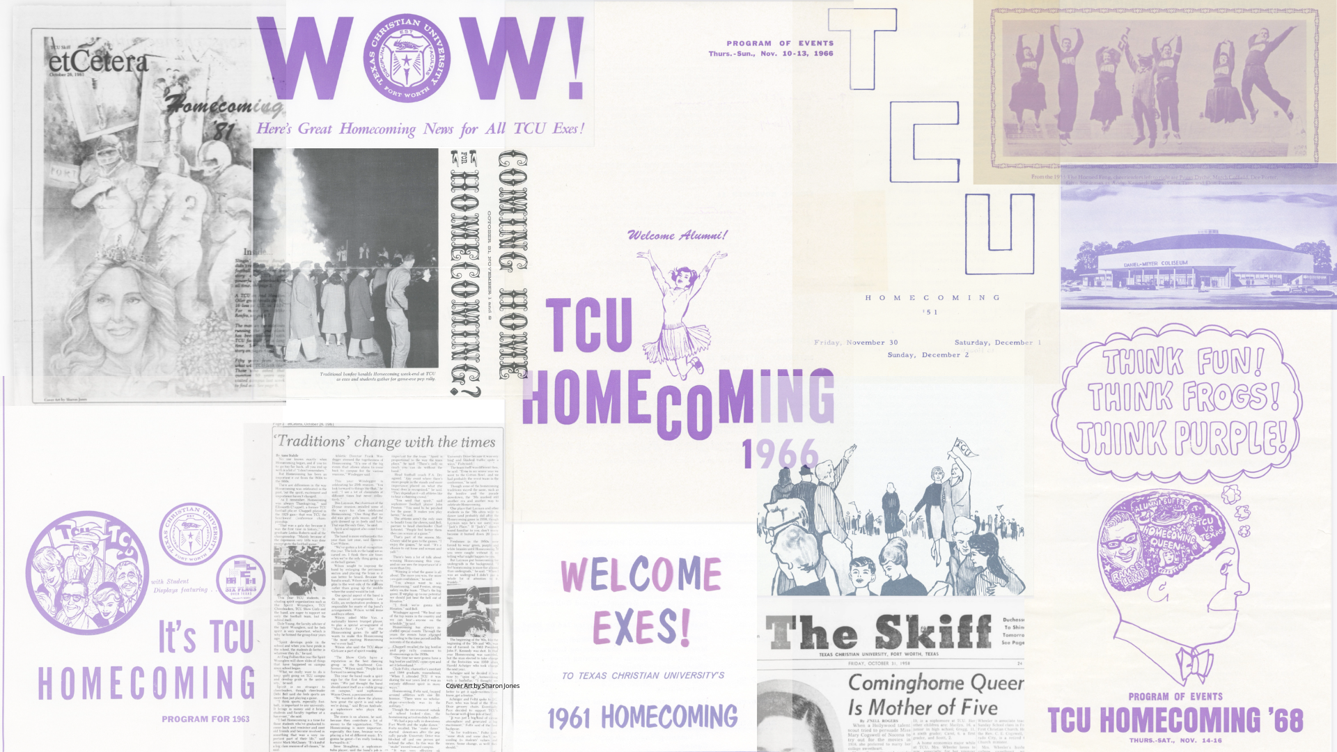 "Homecoming! The greatest invention since the cap and gown," declared a 1950s TCU alumni newsletter. "Reminisce in the old familiar campus spots. Tour the new buildings. Watch the Frogs beat the Baylor Bears."