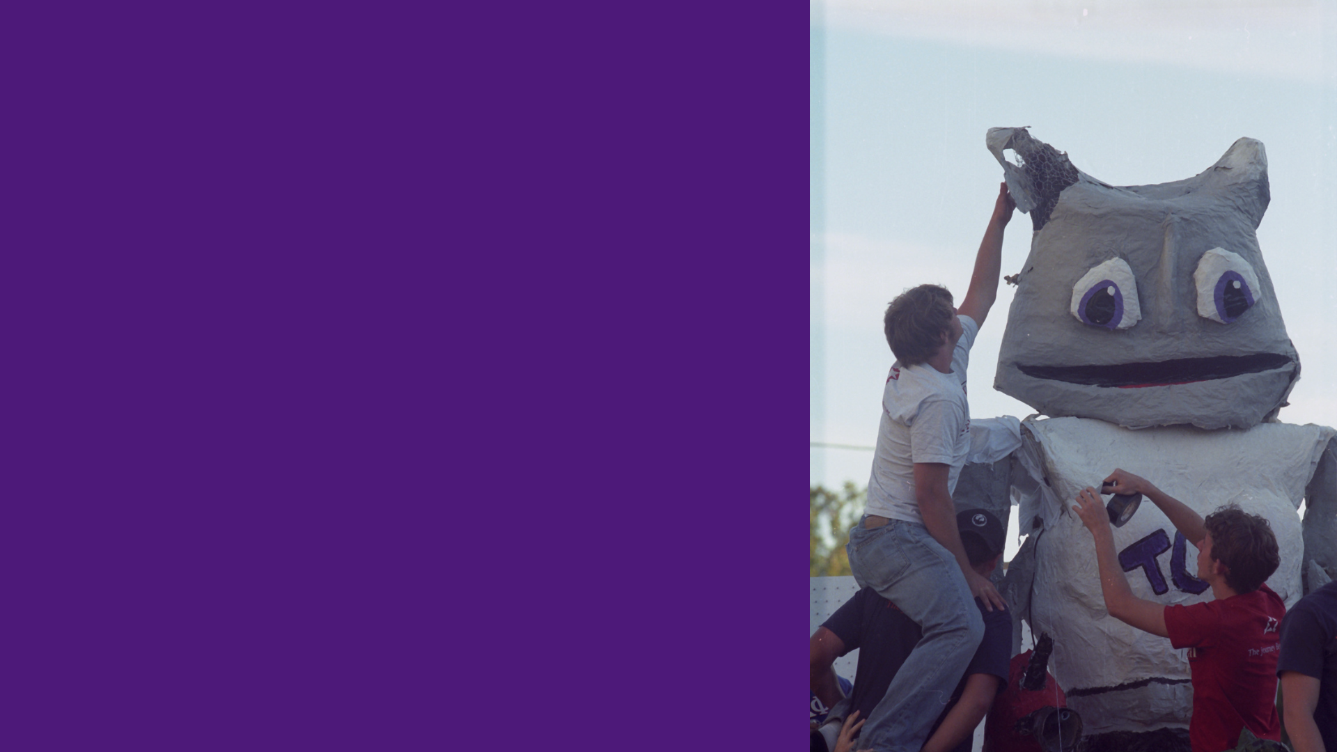 Throughout the decades, TCU's homecoming parade became a vibrant showcase of creativity and school spirit. Carefully crafted floats covered in tissue-paper pomps in shades of purple and white would roll down the street, each representing months of planning and hundreds of hours of work by student organizations.