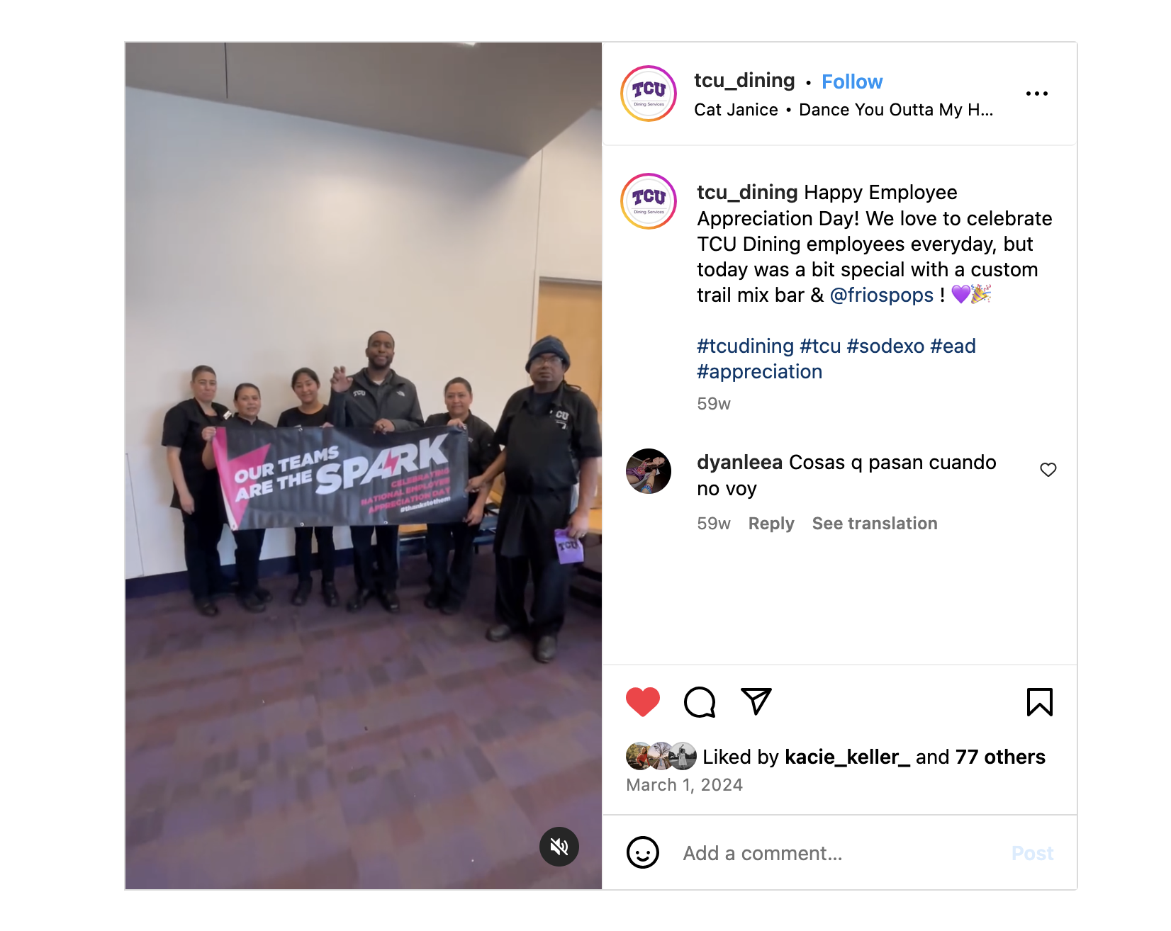 In reviewing TCU’s recent approach to staff recognition on social media, it’s clear there are opportunities for greater consistency and visibility. On March 1, 2024, TCU Dining shared a heartfelt Employee Appreciation Day post, celebrating the hard work and dedication of their team