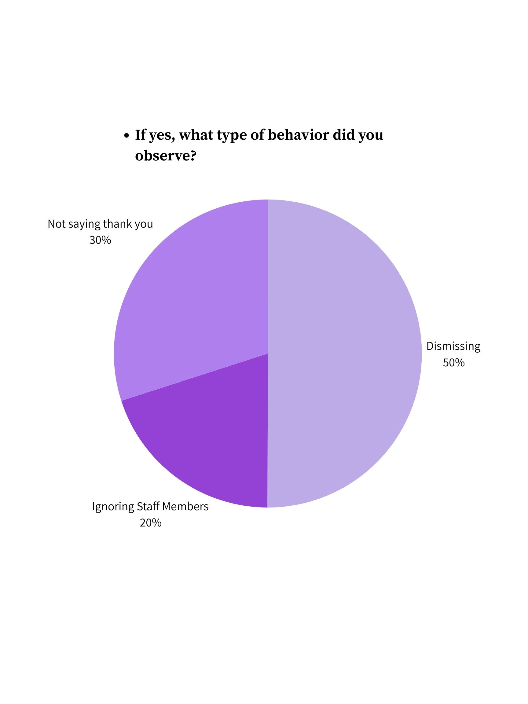 Out of these respondents, 50% saw students dismissing staff, 30% noticed students not saying thank you, and 20% observed students ignoring staff. This means that dismissing staff is the most common disrespectful behavior, but not acknowledging or thanking staff is also common.