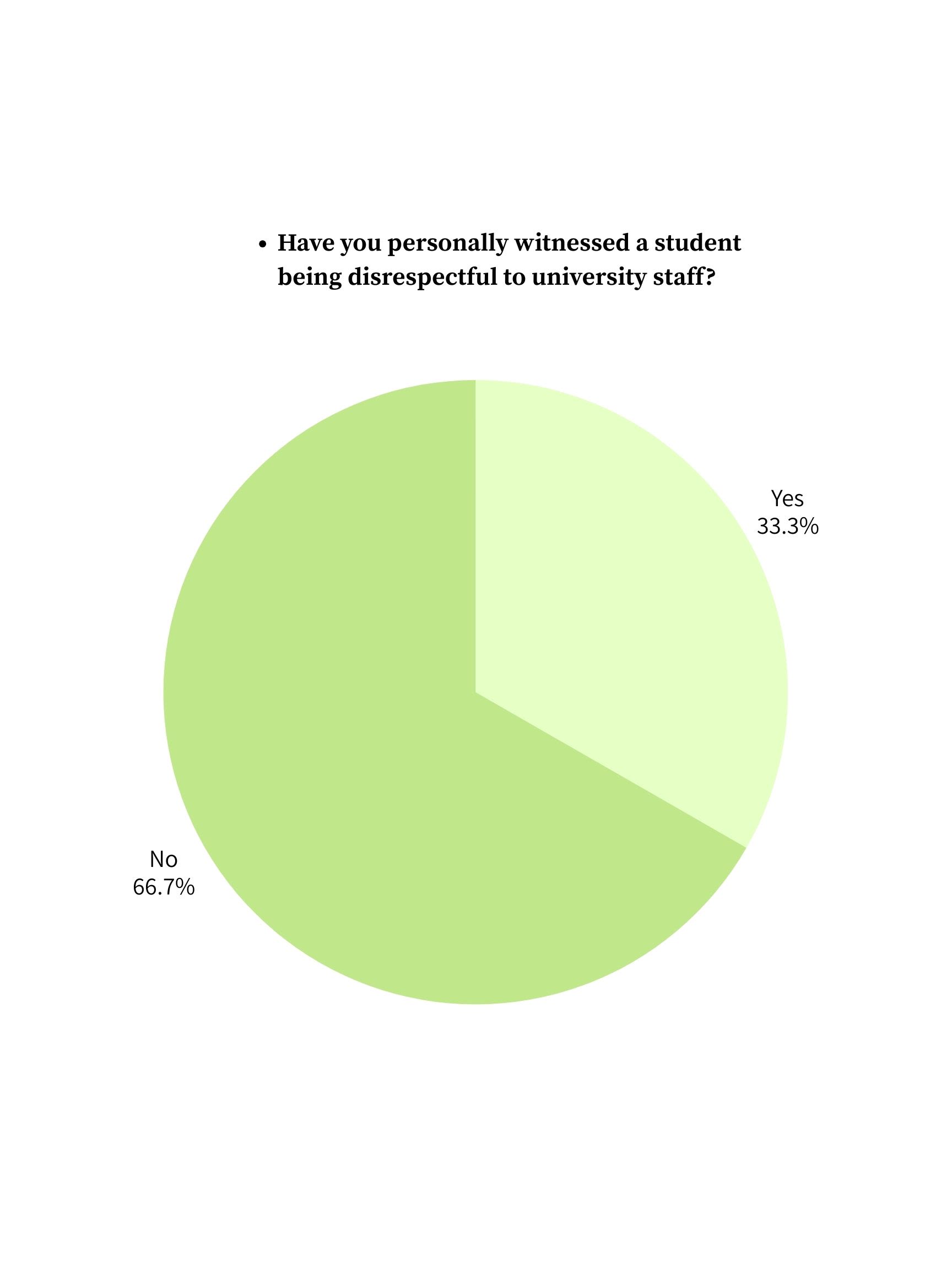 About 67% of students have not seen a peer being disrespectful to university staff, but 33.3% have. This means that while most students haven’t witnessed such behavior, a notable number have, indicating that disrespect toward staff is an issue some students are aware of on campus.