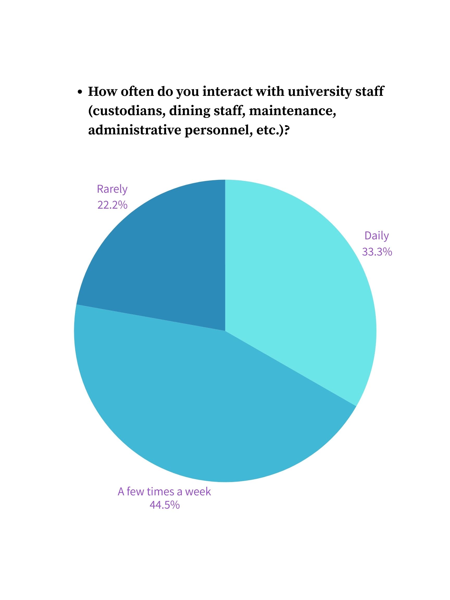 I conducted a survey to better understand how often students interact with staff members, including custodians, dining staff, maintenance personnel, and administrative staff. I also sought to understand students’ observations of respectful or disrespectful behavior in these interactions. I received responses from over 50 students.