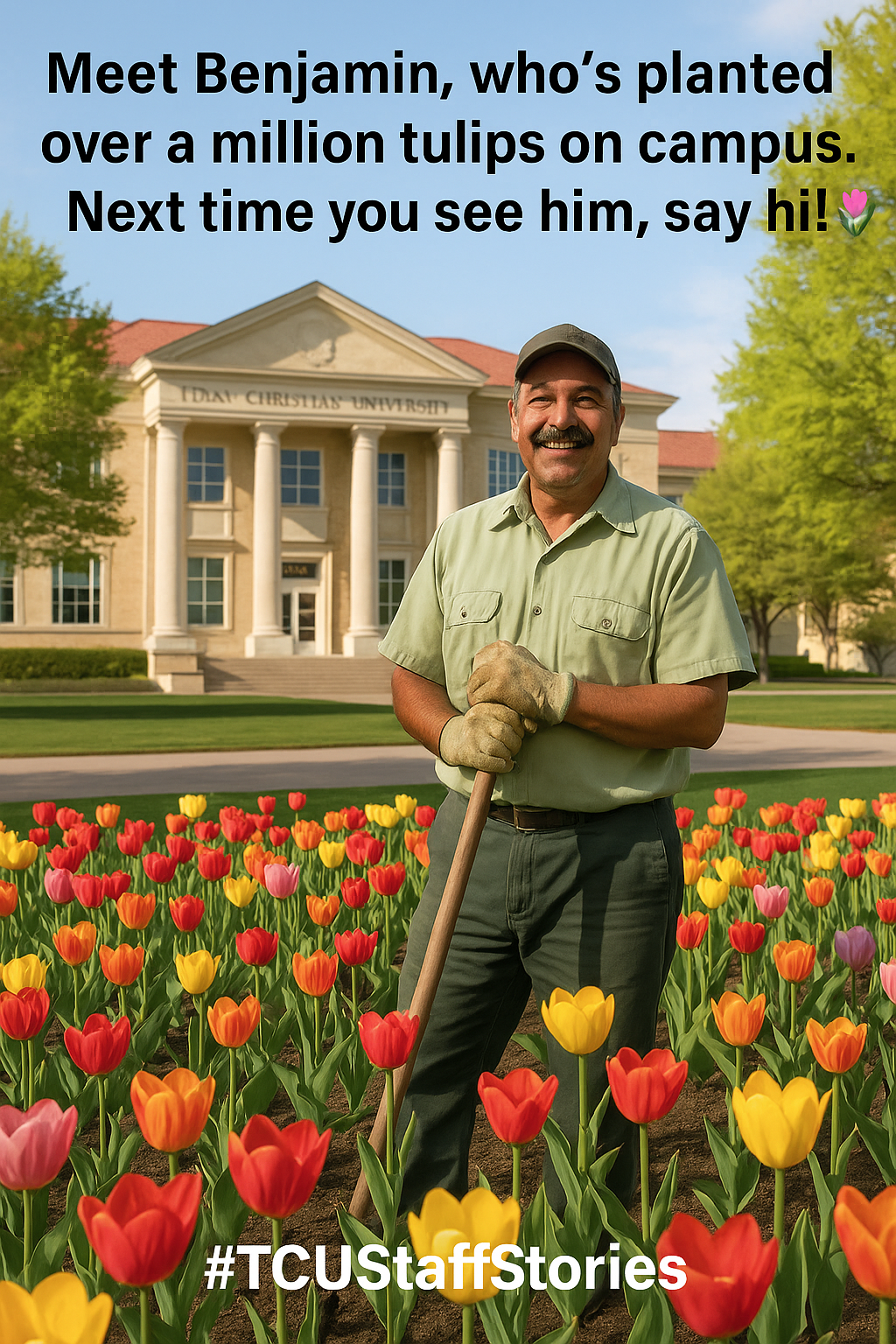“Meet Benjamin, who’s planted over a million tulips on campus. Next time you see him, say hi! 🌷 #TCUStaffStories”