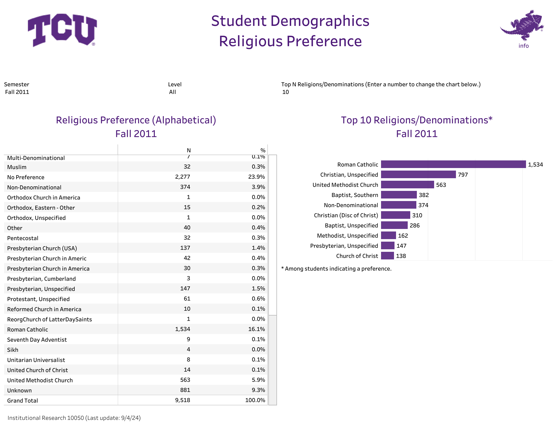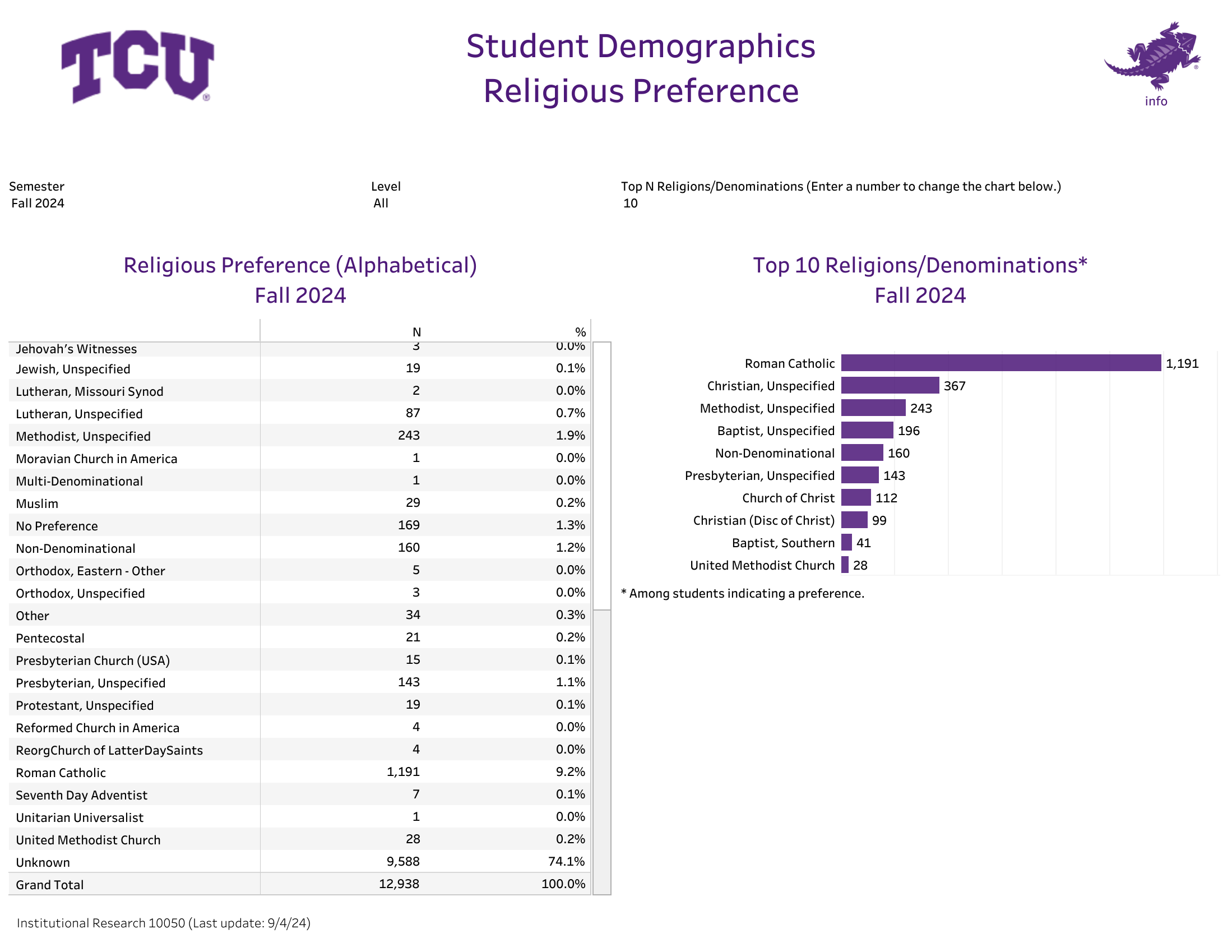 There is a correlation between religious identification and practice between national statistics and the TCU student body. Much like the declining rate of youth nationally, TCU as an institution had a student body where almost 70% of the student body identified with a specific denomination. In 2024, roughly only 25% of students identified with a specific religion.