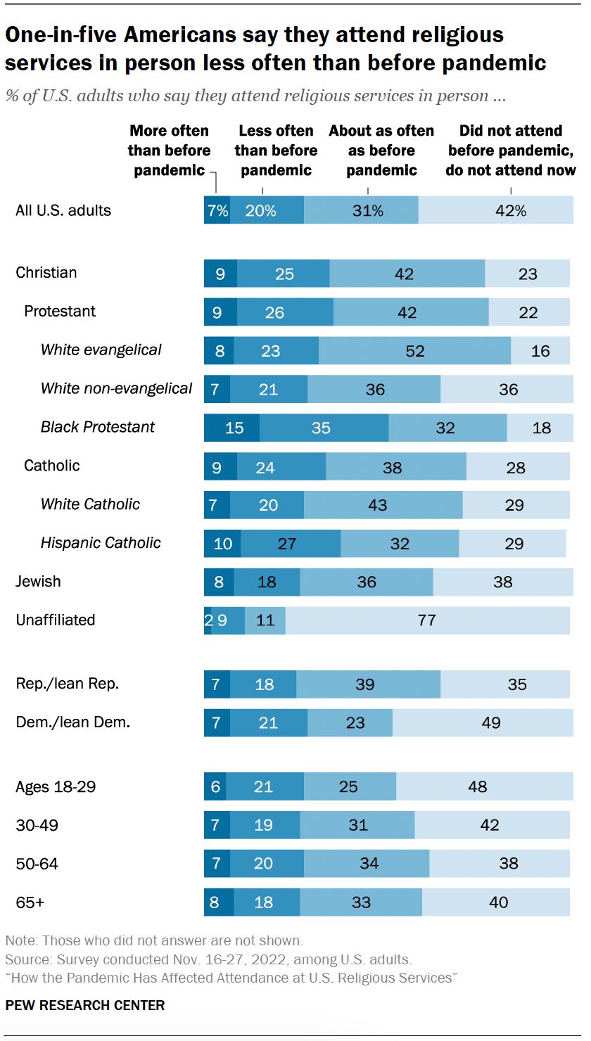 A Pew research study shows church attendance before and after COVID-19 by age group and religion. (Pew Research)