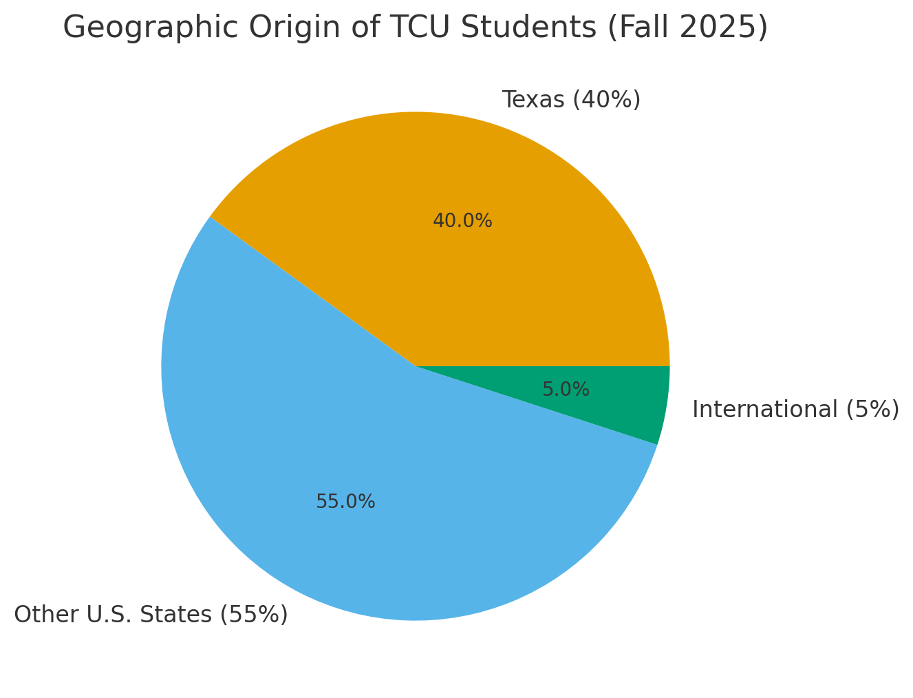 Pie Chart of where TCU students are from as of 2025. (Source: TCU Admission)