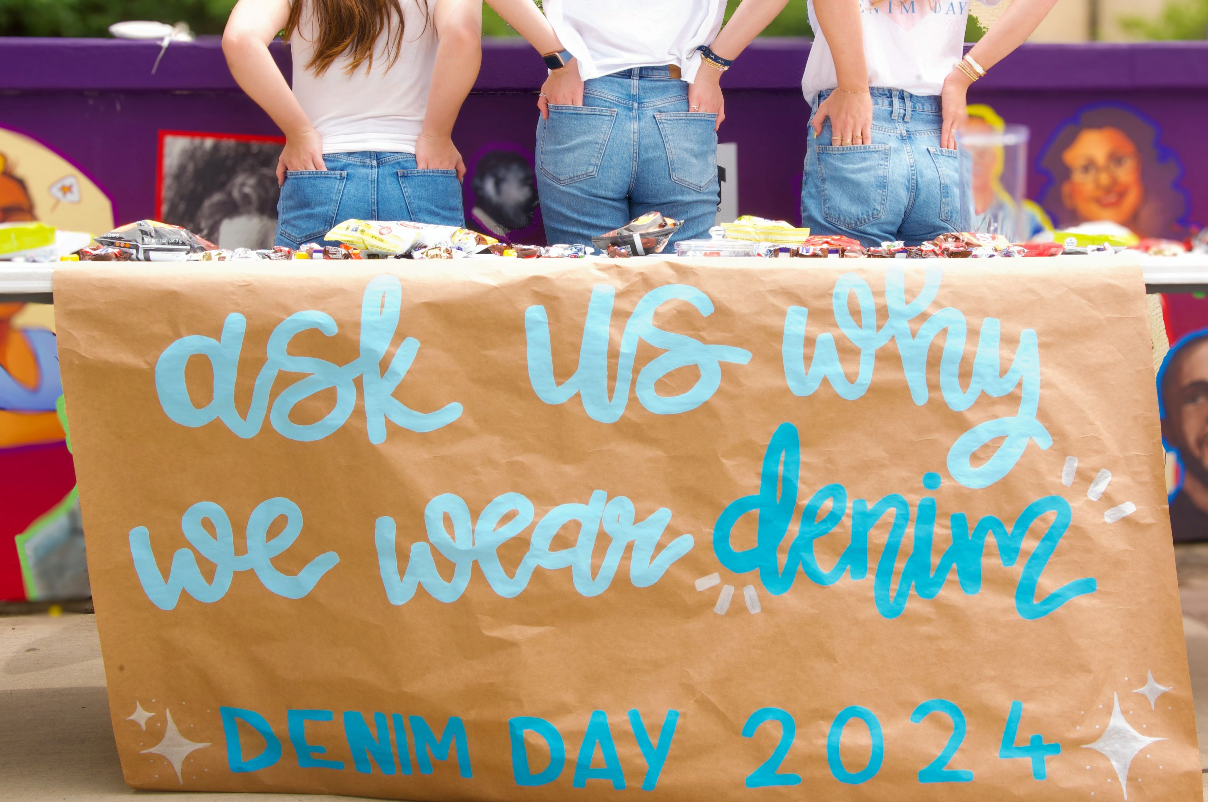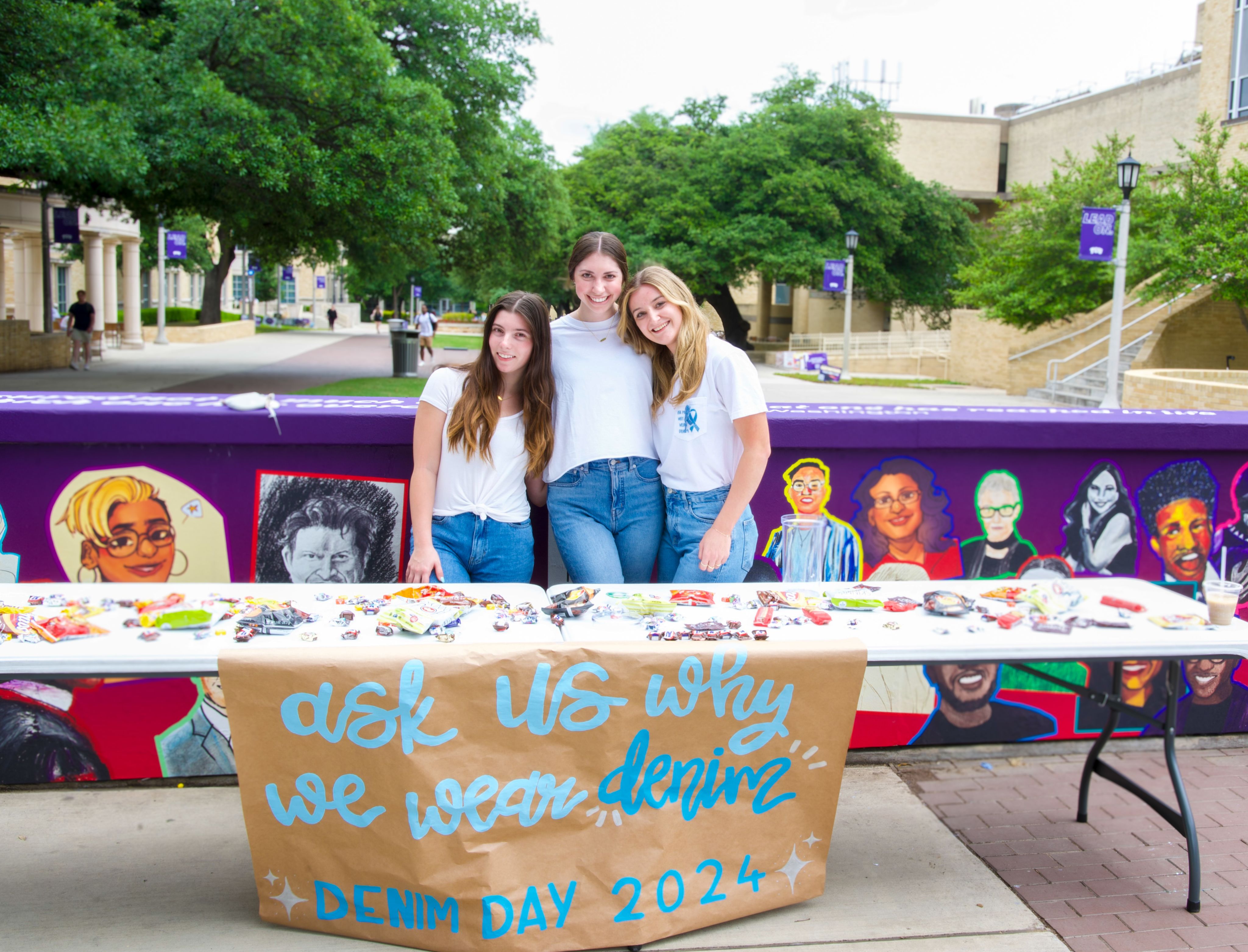Three members of TCU Alpha Chi Omega are tabling in the middle of campus for Denim Day. People around the world show their support for sexual assault survivors by wearing denim on the last Wednesday of April.