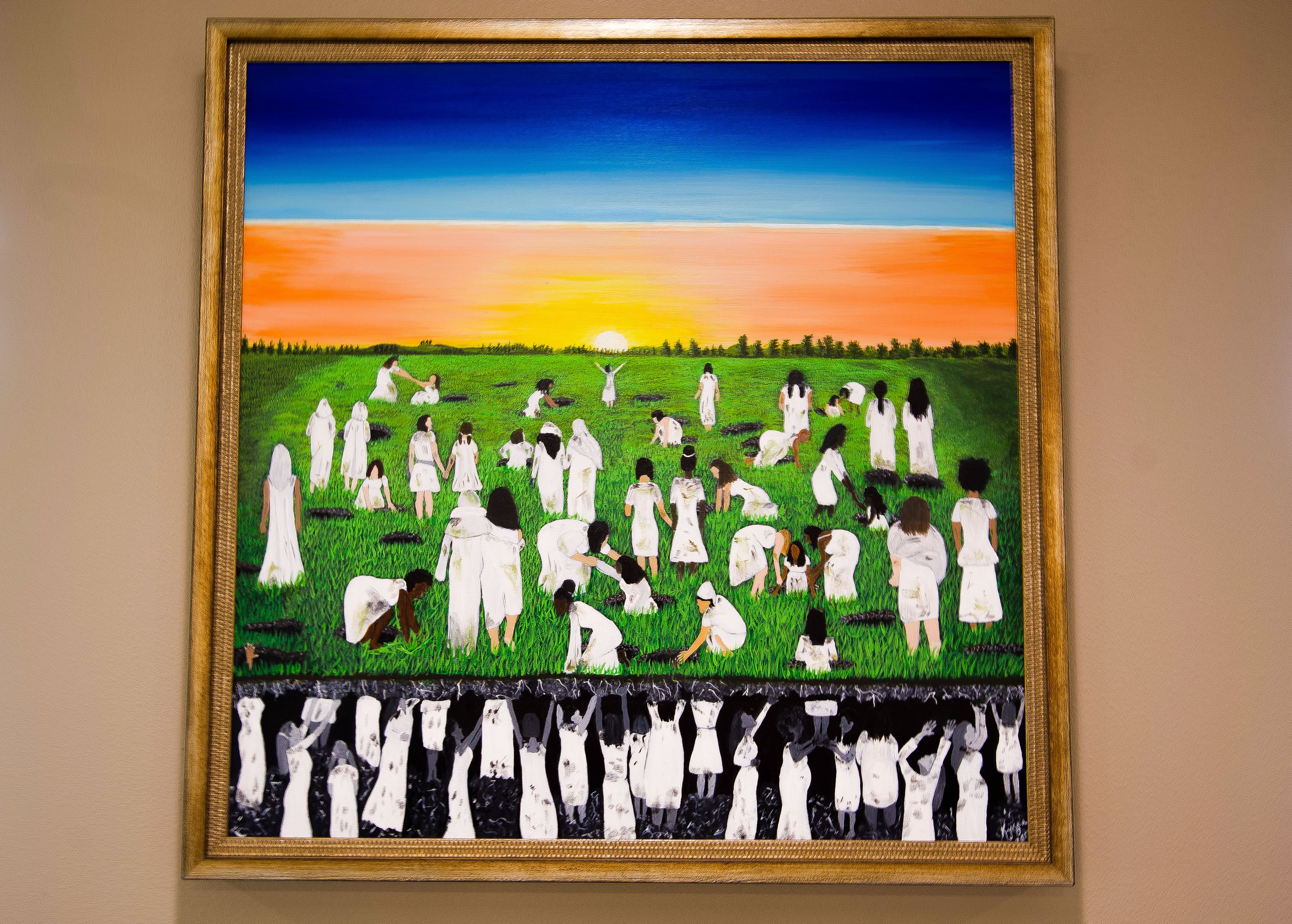 A painting inside The Women's Center depicting women lifting each other up.