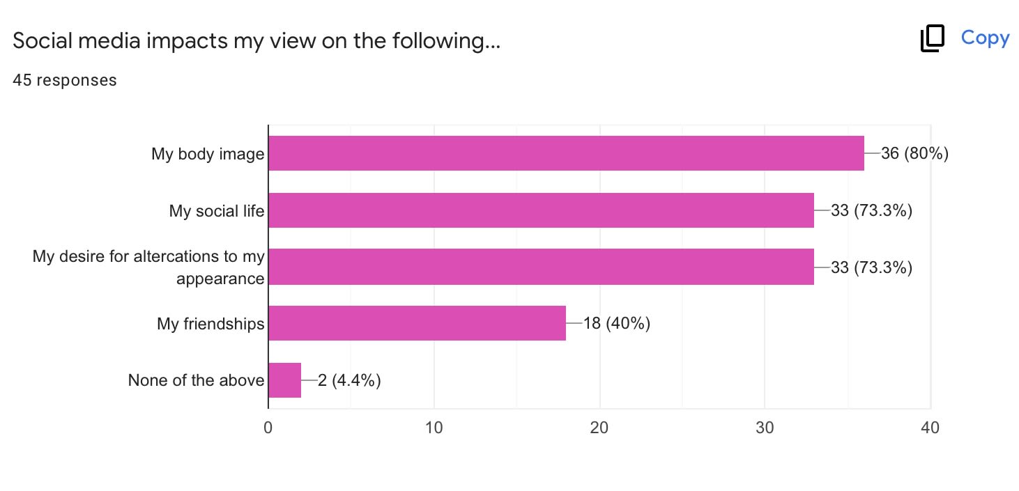 On the contrary, 80% of subjects reported that social media does have an impact on their body image, making this category the number one impacted aspect. Taking a step further, 73.3% said that social media causes a desire to alter their appearance based on the images that they see online.