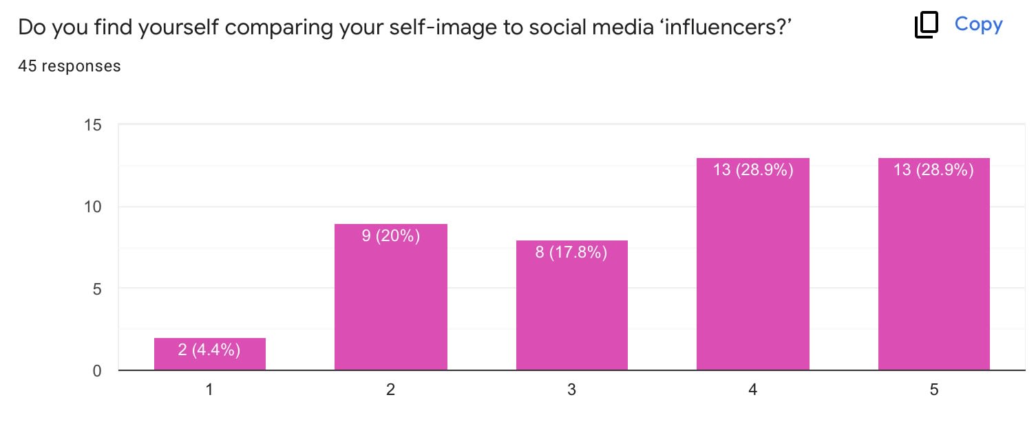 Comparison was a common theme among respondents who were dissatisfied with their bodies. The survey showed that the most comparison for TCU females was made between themselves and social media influencers. ‘Influencers’ are by no means a new concept of society, they have just shifted their platform to the online world. A social media influencer can have thousands of followers to millions of followers, yet one thing remains consistent- their ability to sway their followers into buying products, fashion trends, personal beliefs or looking a certain way.