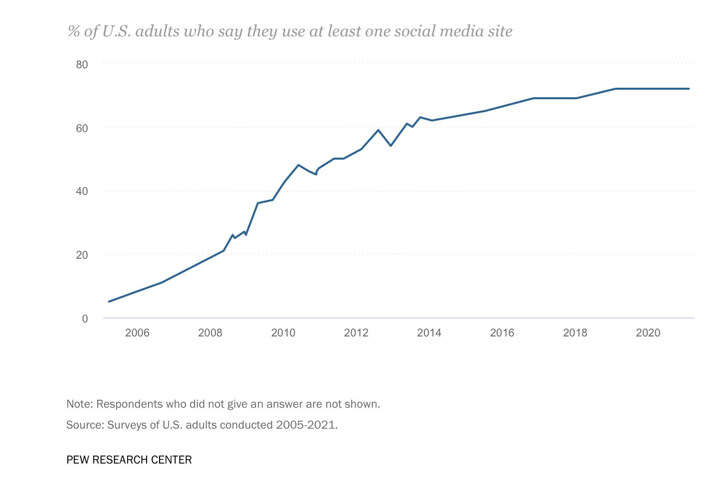 The online world of social media connects people in a matter of seconds. The Pew Research Center began tracking social media use for Americans in 2005 and found that 5% of Americans were active users. Today that number has rocketed to approximately 72% of the U.S. population using some type of social media. With an increase of users, follows an increase of sites.