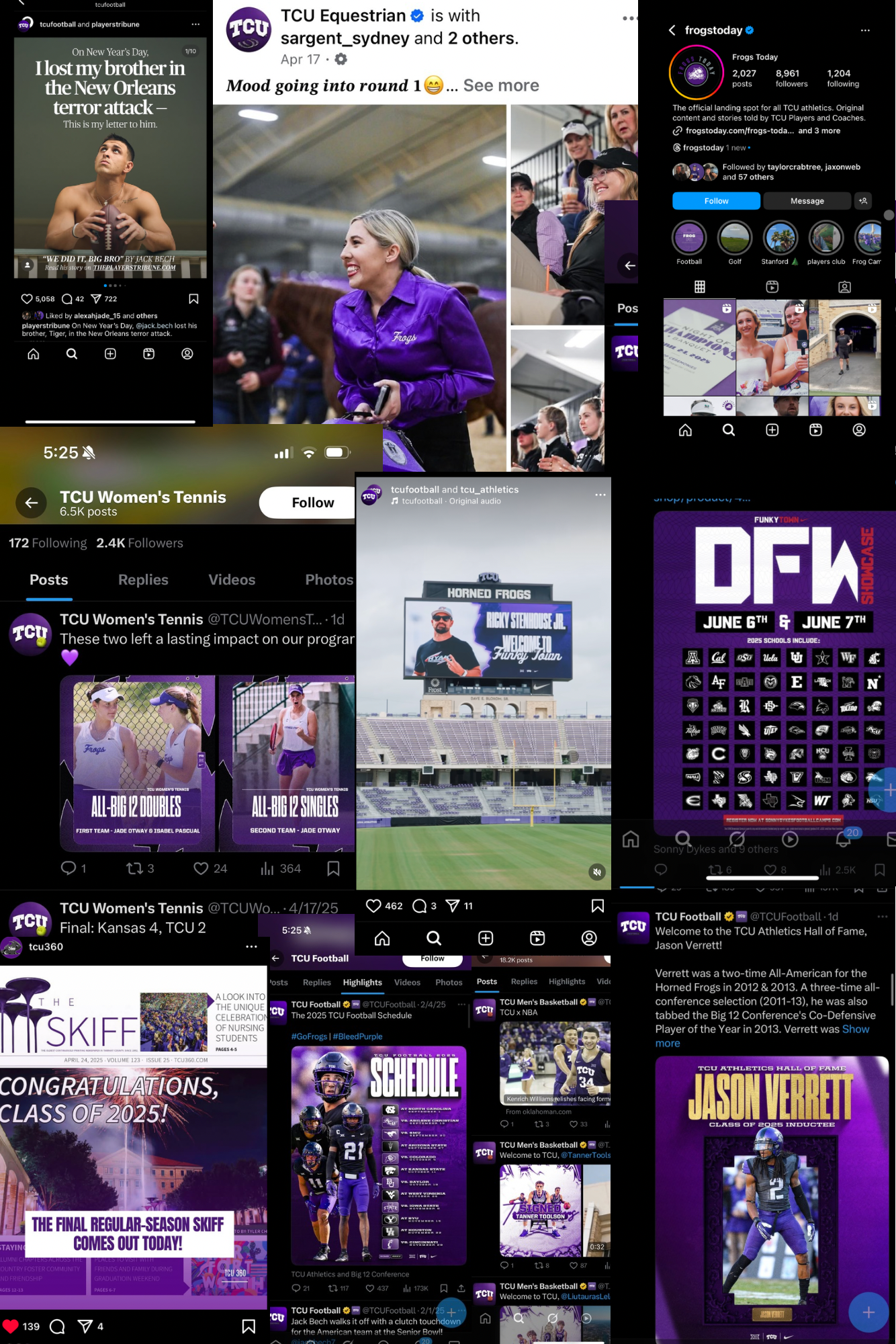 A collage shows various ways TCU Athletics and university media accounts use social media to share sports updates. Platforms like Instagram, X and TikTok help students stay connected to campus teams.