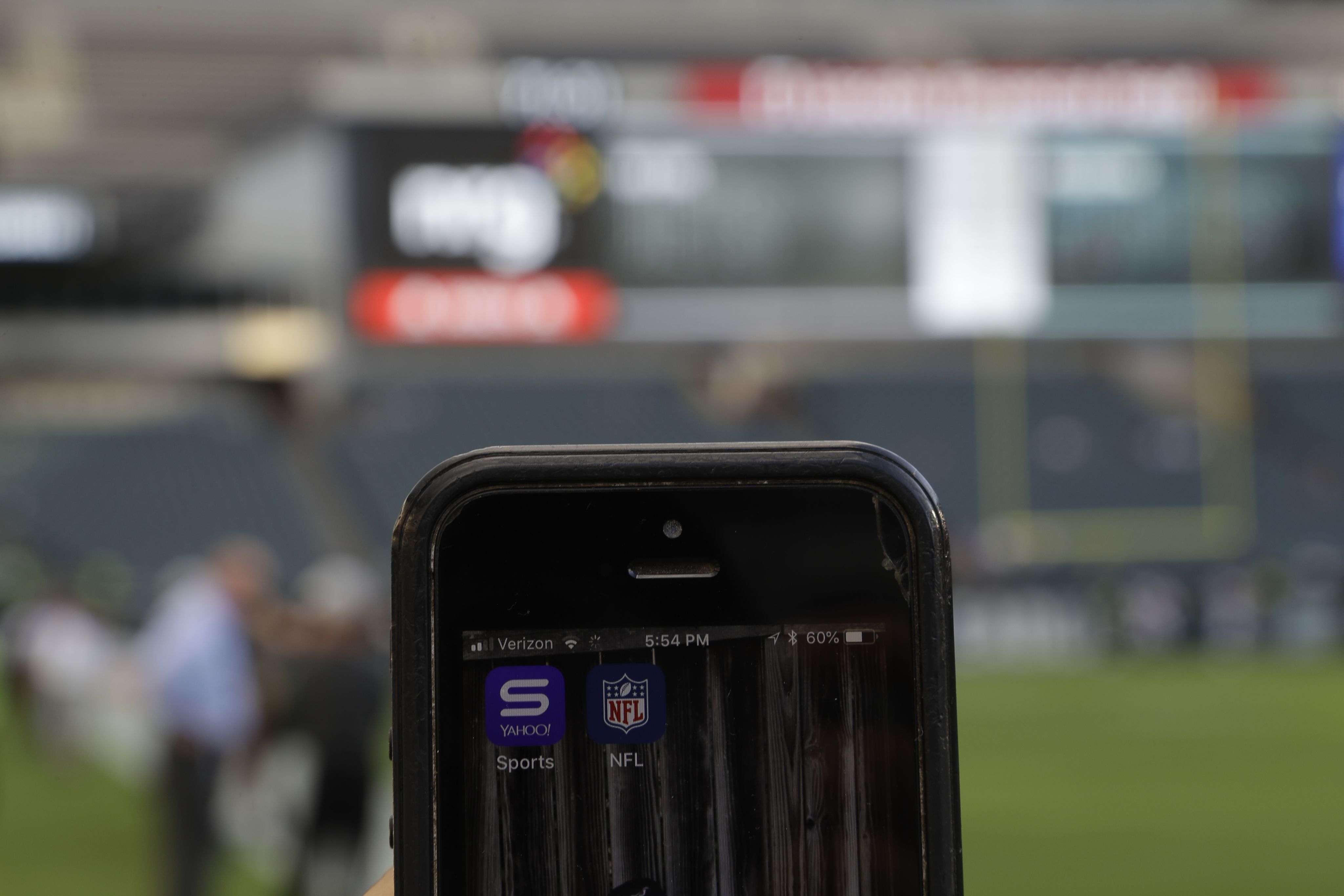 A phone home screen shows the NFL and Yahoo Sports apps. Many rely on mobile apps to follow games, check scores and manage fantasy teams. (AP Photo/Matt Rourke)