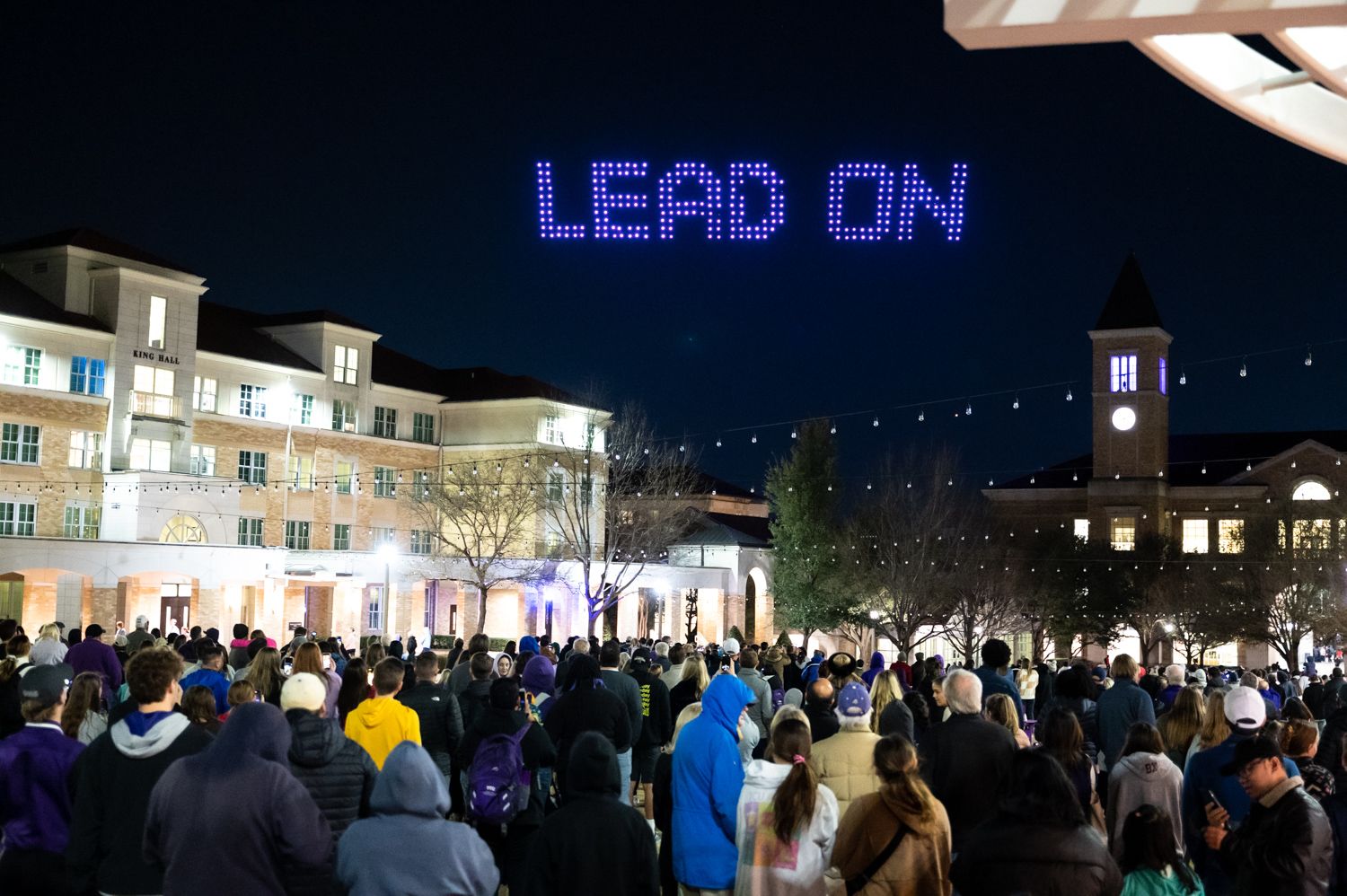Texas Christian University drone show celebrating 150th anniversary in Campus Commons display Lead On, on January 27th, 2023.