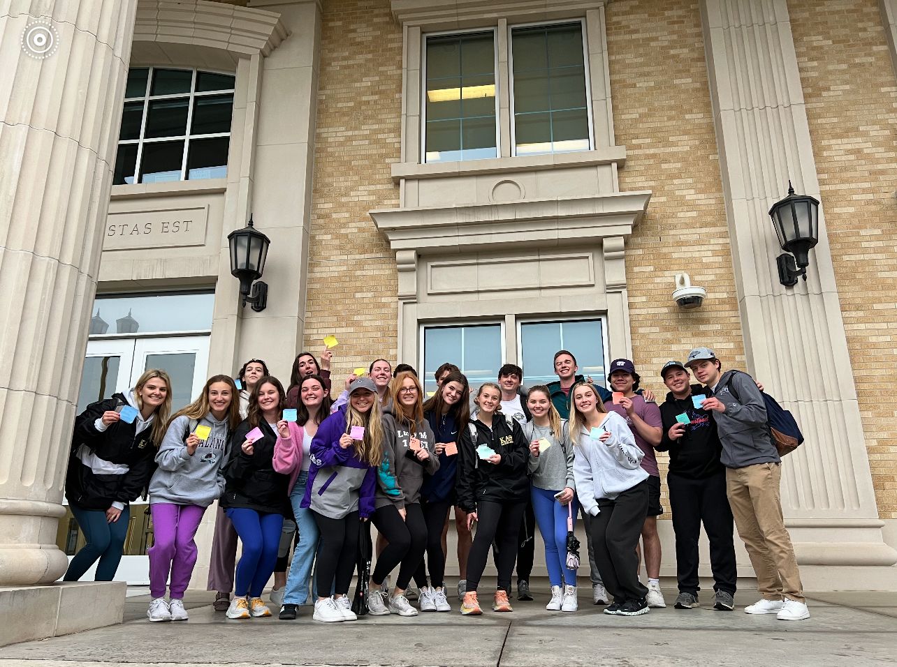 Club members outside of a TCU campus building as they hand out their weekly kind-worded sticky notes. (Courtesy of Katie Nguyen/IOW Marketing Chair)