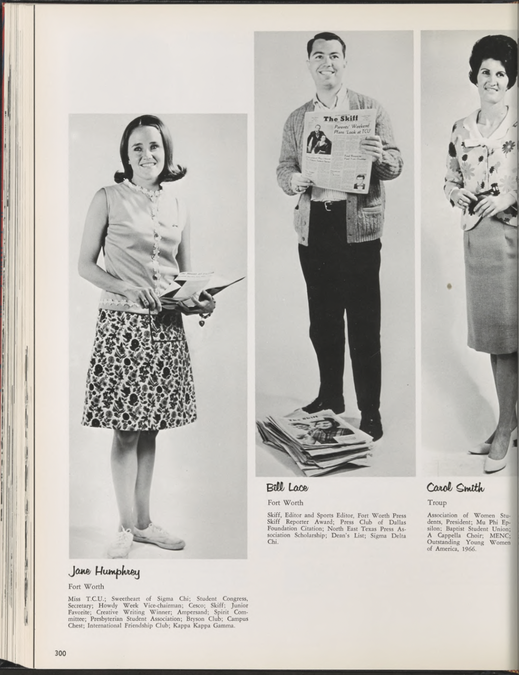 This report was compiled using reporting done by students enrolled in JOUR 30233, spring semester 2022. Together, students researched the academic, economic and social history of TCU over the last 150 years. The reporters focused on the visual evolution of fashion, academics, social life, construction, leaders and sports at TCU. The reporters included: Courtney Carr, Tenae Durham, Jarrett Harding, Kathryn Lewis, Iris Lopez, Skye Moreno, Isaac Percastegui, Claire Powell and Ariel Wallace.