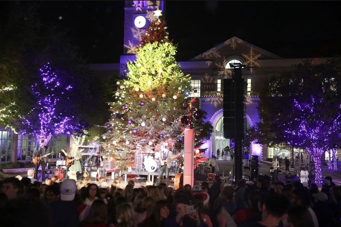 The Christmas tree lights up the Commons as Drew and Ellie Holcomb fill the space with song. (Photo courtesy of @texaschristianuniversity via Instagram)
