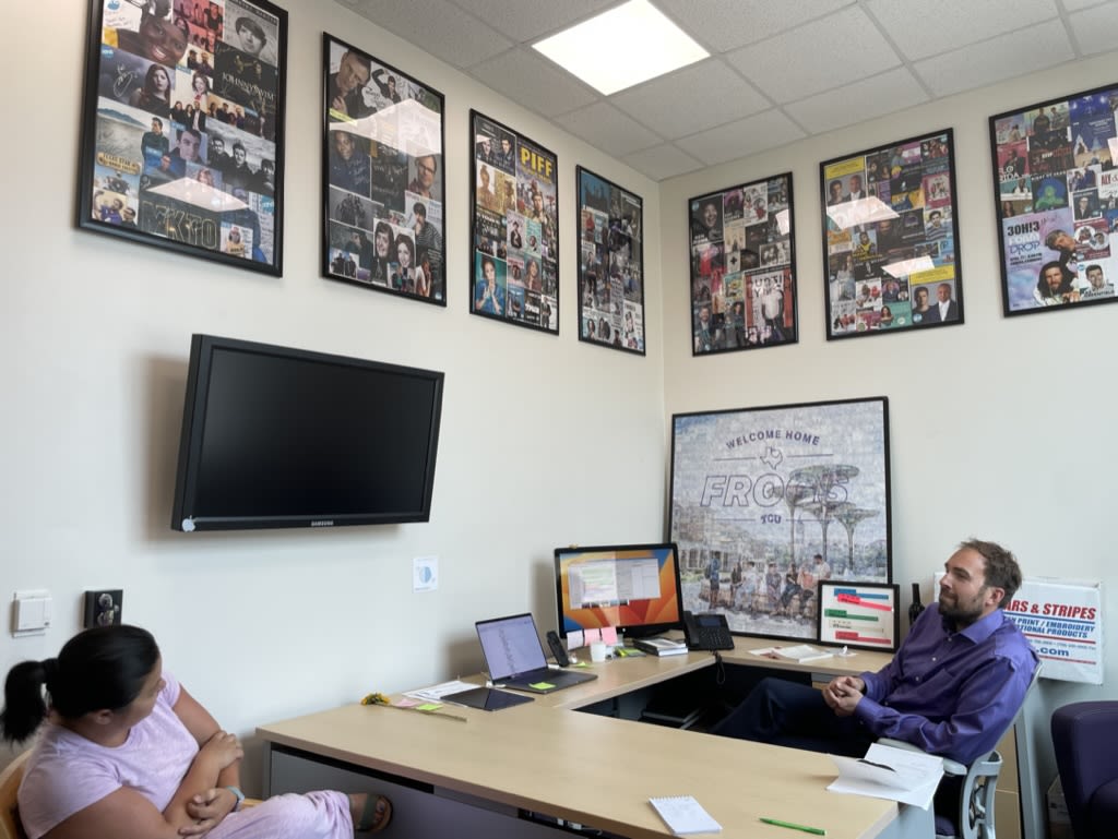 Associate Director of Student Activities Kelly Lee and Director of Student Activities Brad Thompson sit in Thompson's office under collages of TCU events. (Ella M. Mercer/Staff Writer)