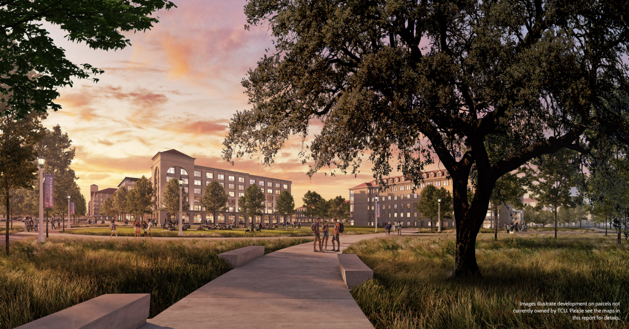 TCU included three new green spaces in the Campus Master Plan. The Chancellor’s Green will be near the Harrison, and mock-ups of the new space include green areas for outdoor classes, fresh walkways and plenty of new trees.