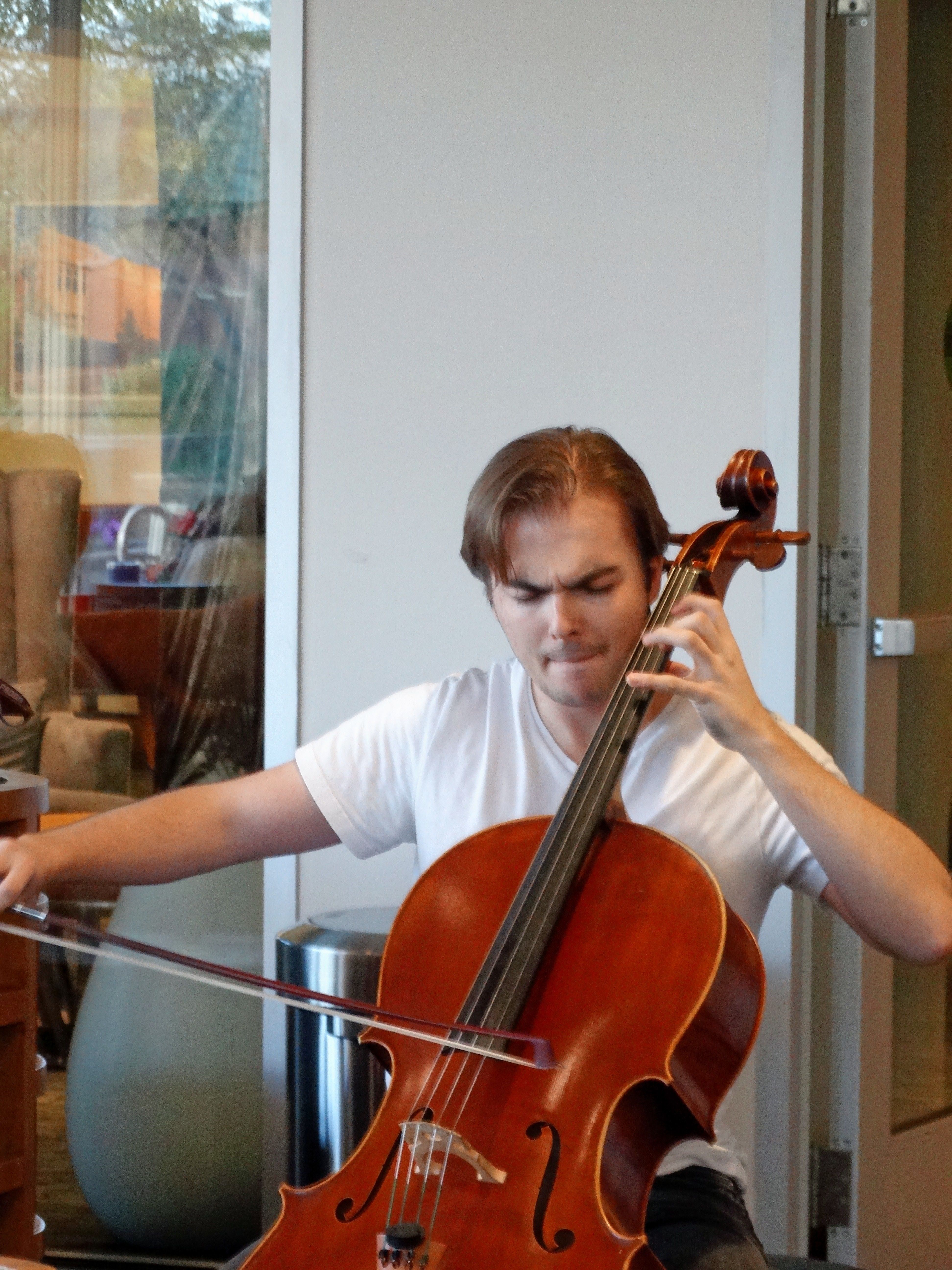 O'Gara's bow floats just above the strings of his cello, held in a wave of stillness in anticipation of its inevitable fall. Everyone quiets.