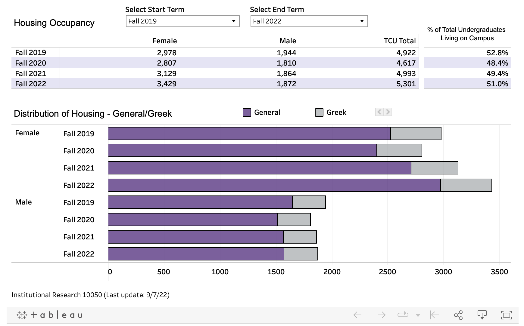 As of Fall 2022, 51% of undergraduate students reported living on campus. To break that down further, that means nearly all first-year and sophomore students are primarily living on campus, while juniors and seniors, who are given the option for off campus housing, are primarily living off campus.