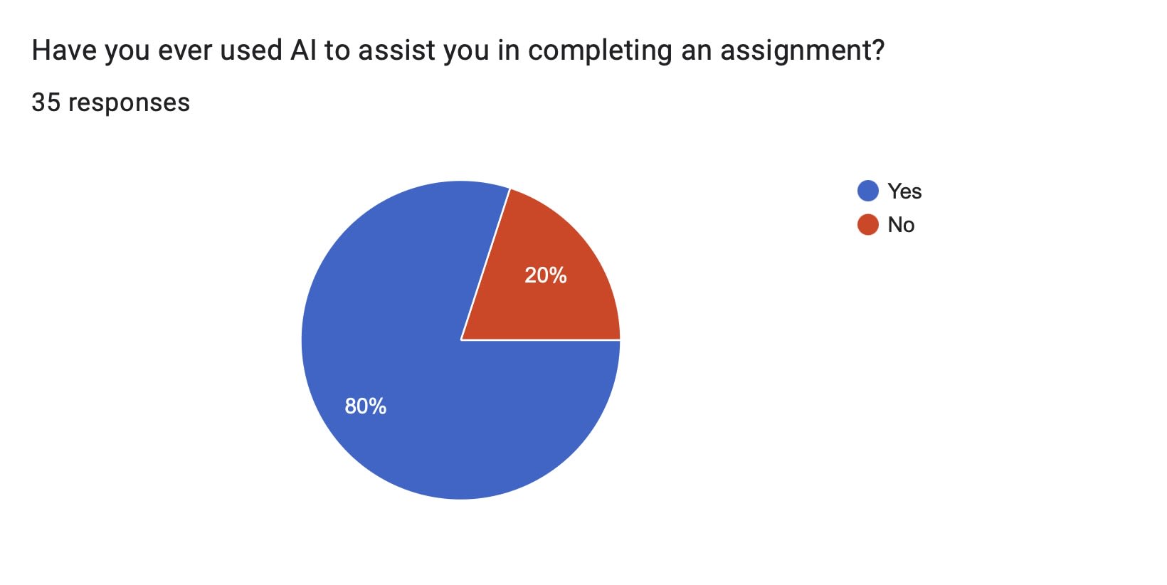 80% of students surveyed responded yes when asked if they have ever used AI to complete an assignment. These results suggest that students are adapting alongside technology to assist with workloads.