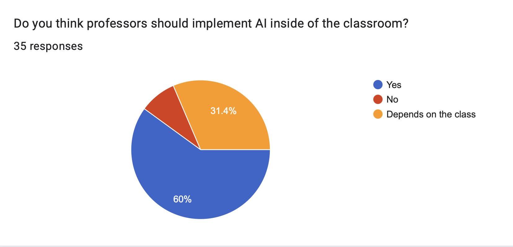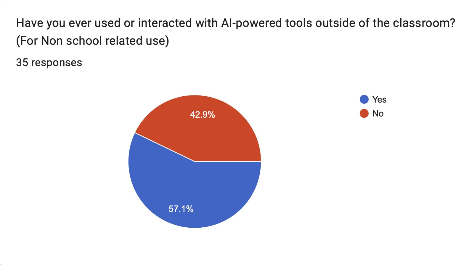 57.1% of students surveyed responded yes to using AI outside of the classroom. These results suggest that students are incorporating AI into their everyday lives.