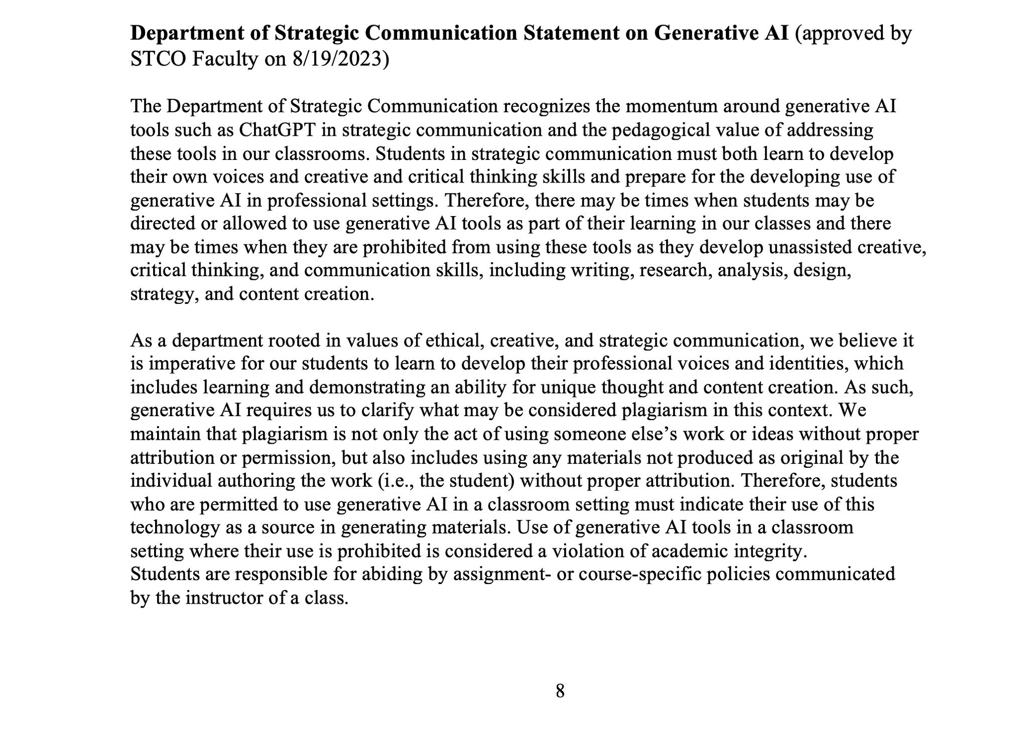 A great example of acknowledging the impact of AI comes from the Department of Strategic Communication. Departments who acknowledge the impact of AI and manage students' expectations up front, are more likely to see positive results with the use of AI. "I don't think any tool is inherently evil, or unethical, but I think any tool can be used unethically," said Bunton.