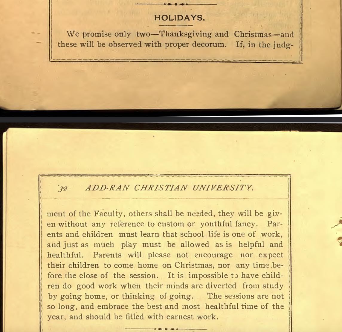 This year's tree lighting comes as students prepare for dead days and to go home for the holidays, but this wasn’t always the case. When TCU was known as AddRan Christian University, parents couldn’t always expect to have their kids come home for the holiday.