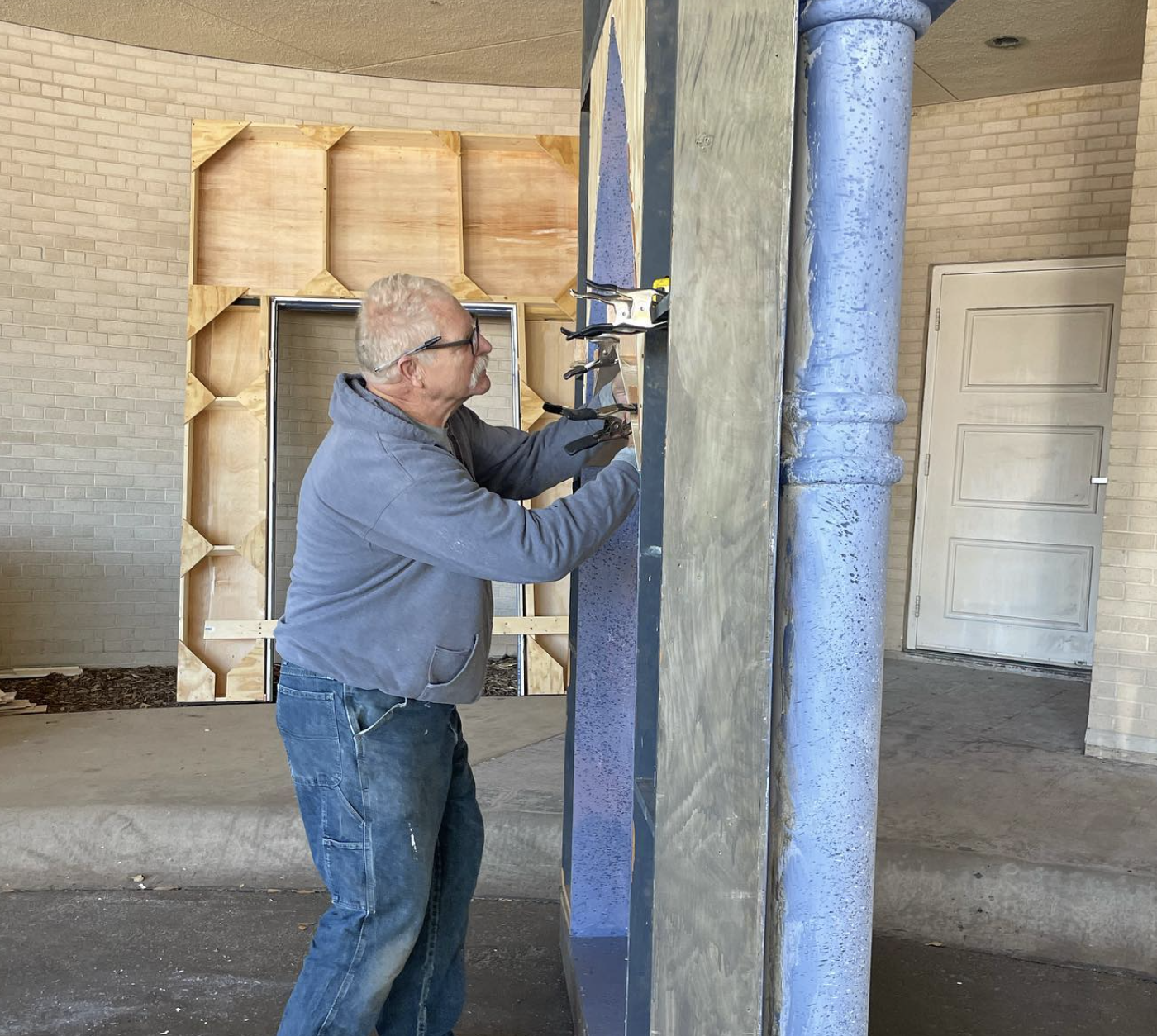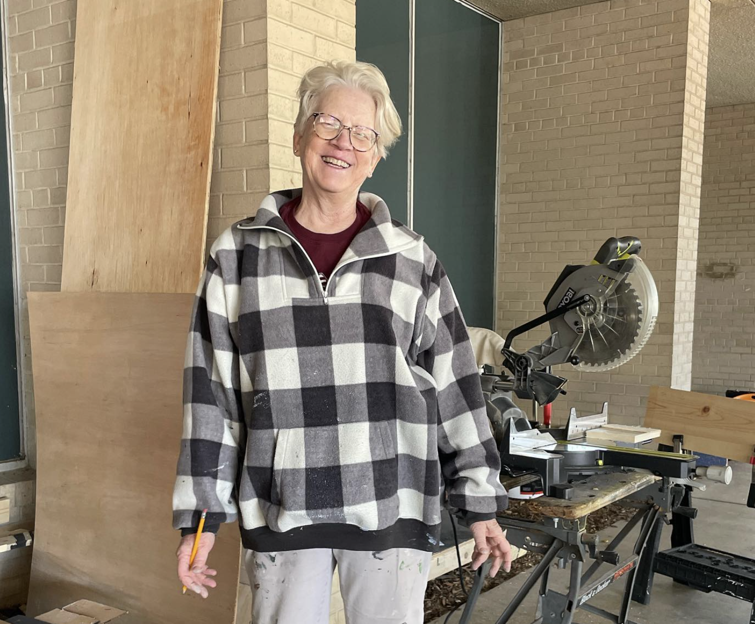 They work in the theatre or under the canopy over the driveway of the repurposed funeral home. But they have to be careful. The doors to the theatre are standard. They have to make sure if they build something outside, they can get it inside.