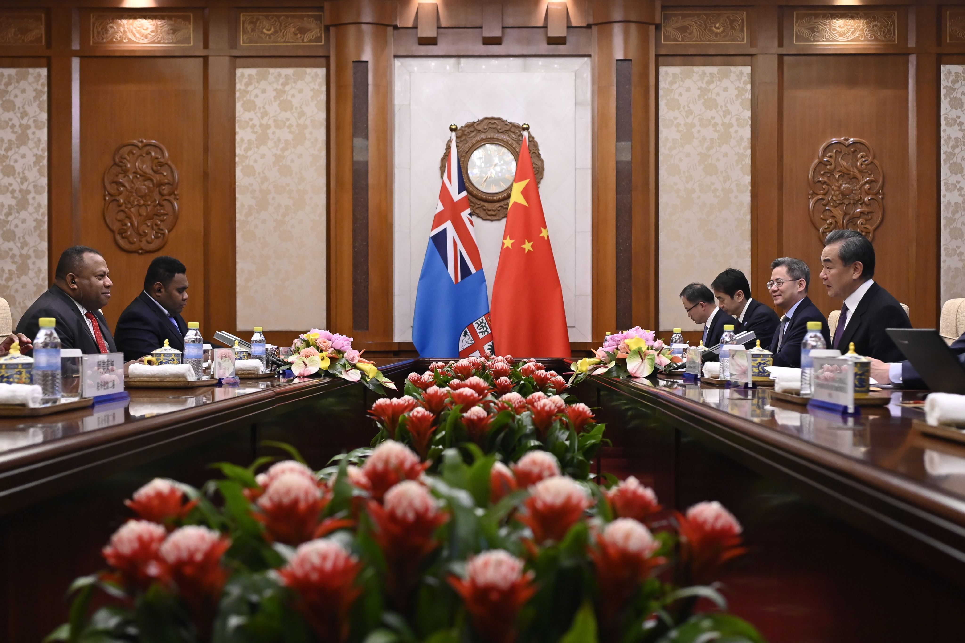 Chinese Foreign Minister Wang Yi, right, and Fiji's Minister for Foreign Affairs Inia Seruiratu meet at the Diaoyutai State Guesthouse Tuesday, June 11, 2019, in Beijing. (Wang Zhao/Pool Photo via AP)