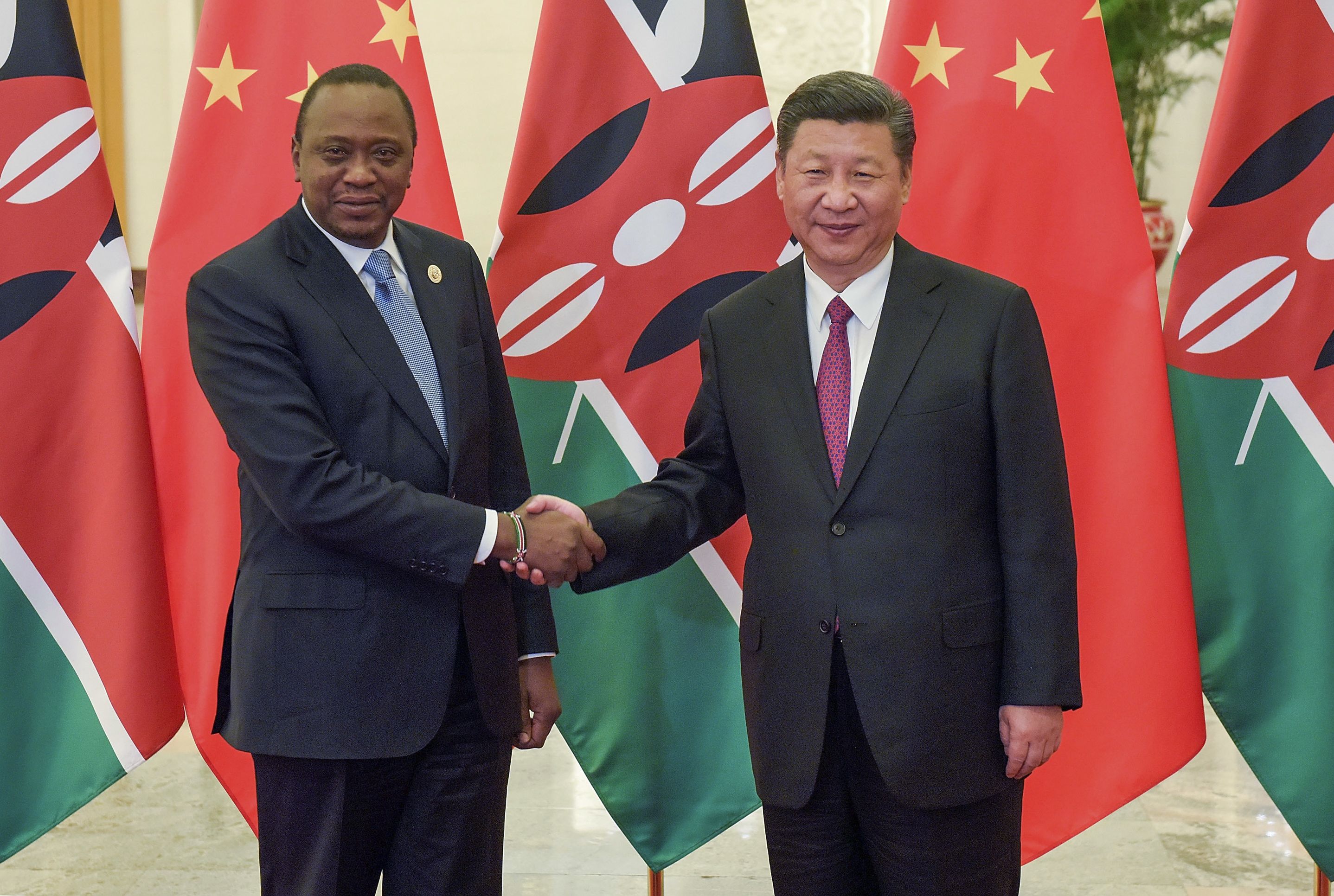 Kenyan President Uhuru Kenyatta, left, and Chinese President Xi Jinping pose for photographers, in Beijing, Monday, May 15, 2017. (Etienne Oliveau/Pool Photo via AP)