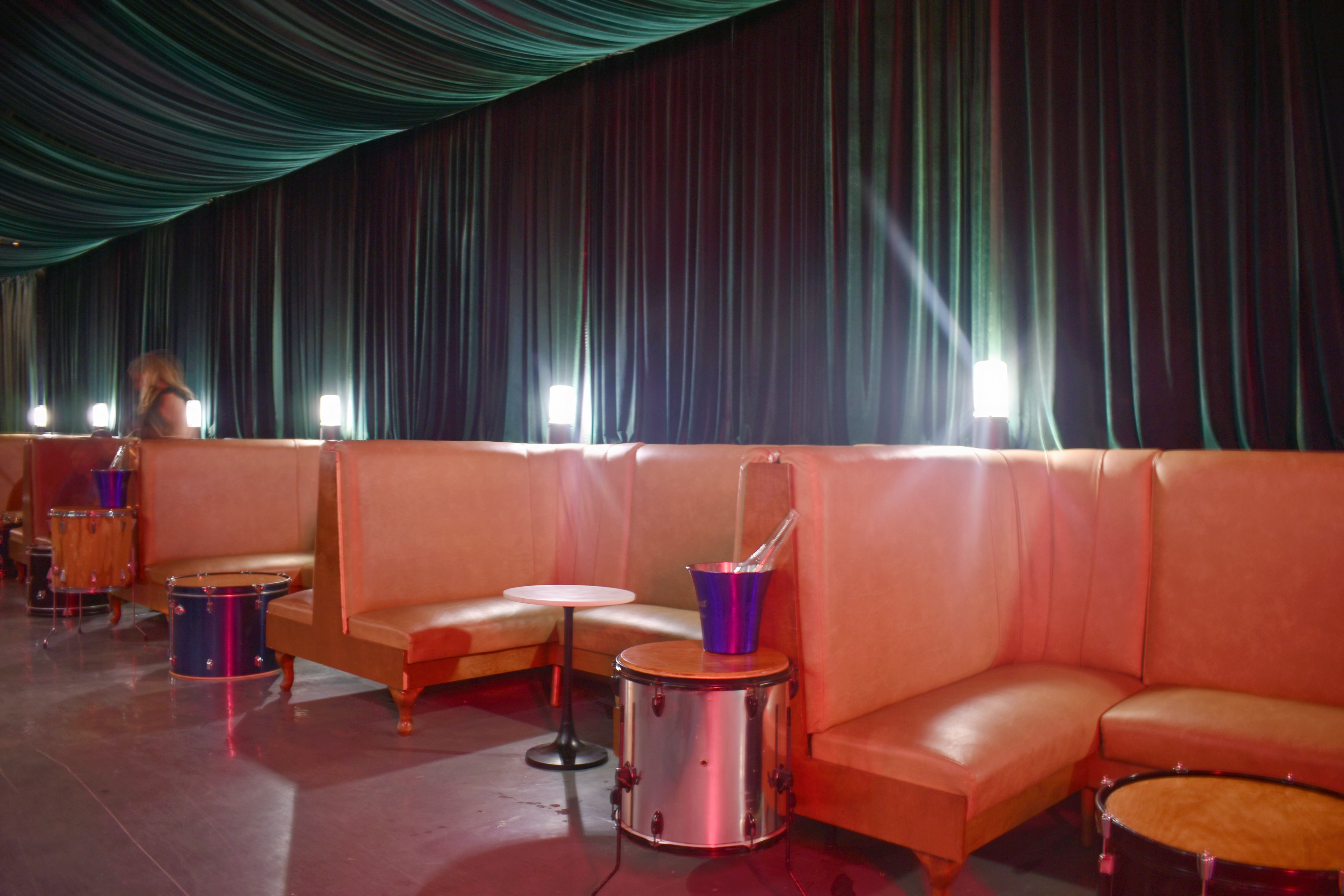 Inspired by upscale lounges in Miami and Vegas, green velvet curtains surround the room while seating arrangements range from leather booths for groups to congregate, tables surrounding the stage, and bar seating.