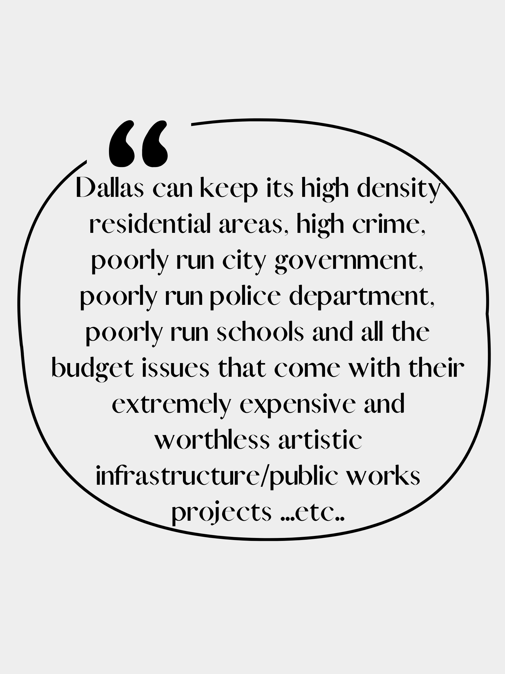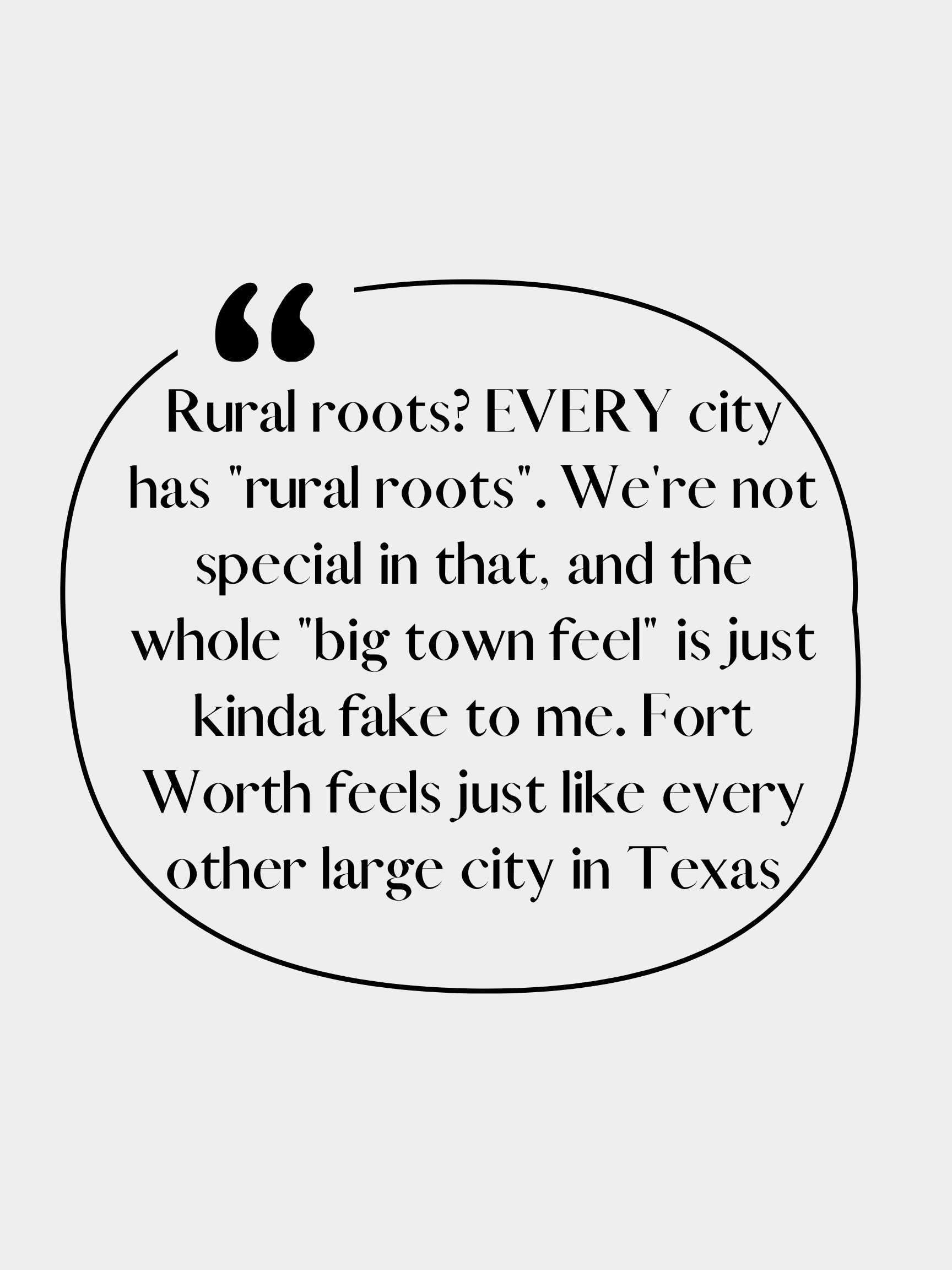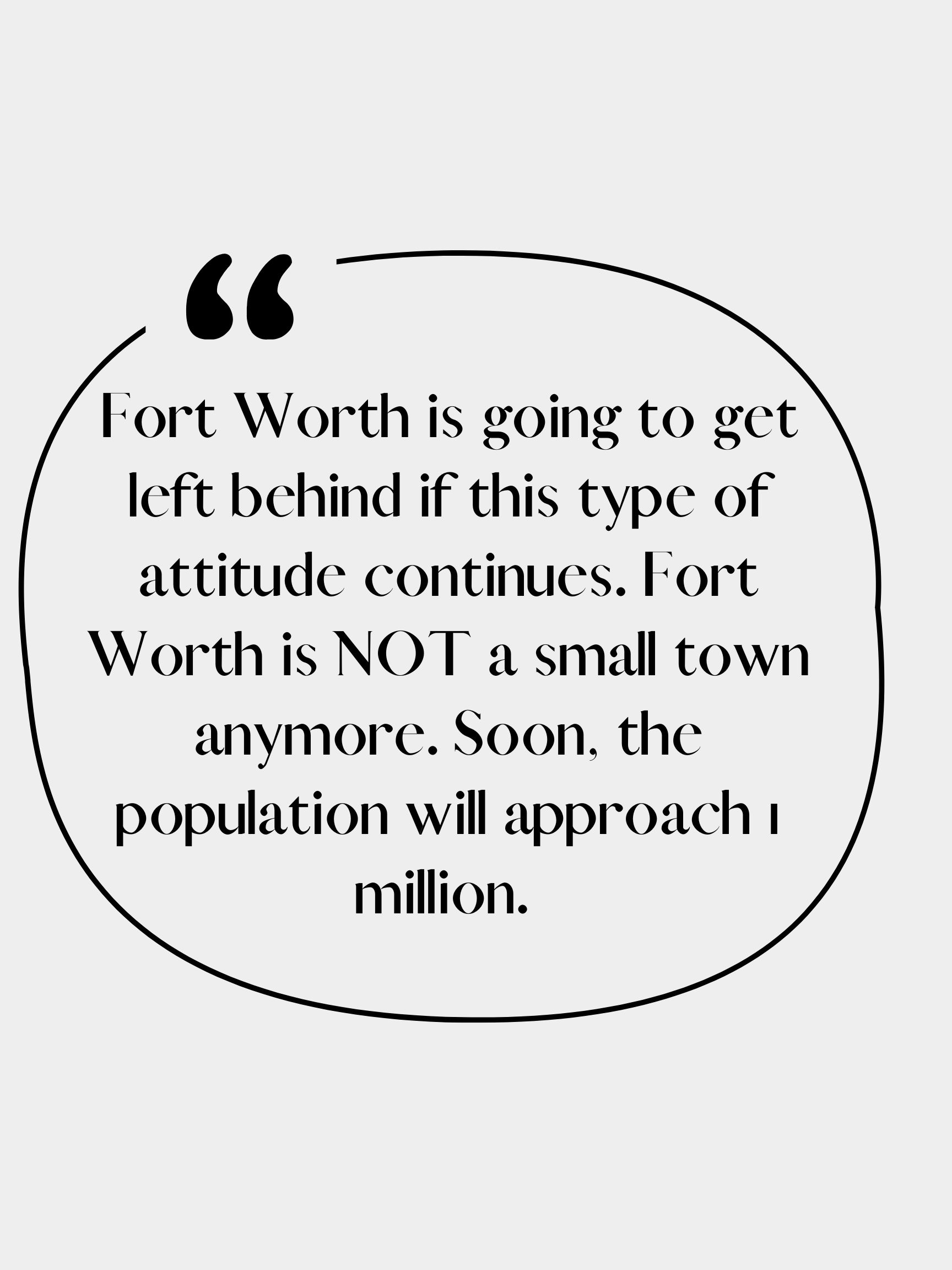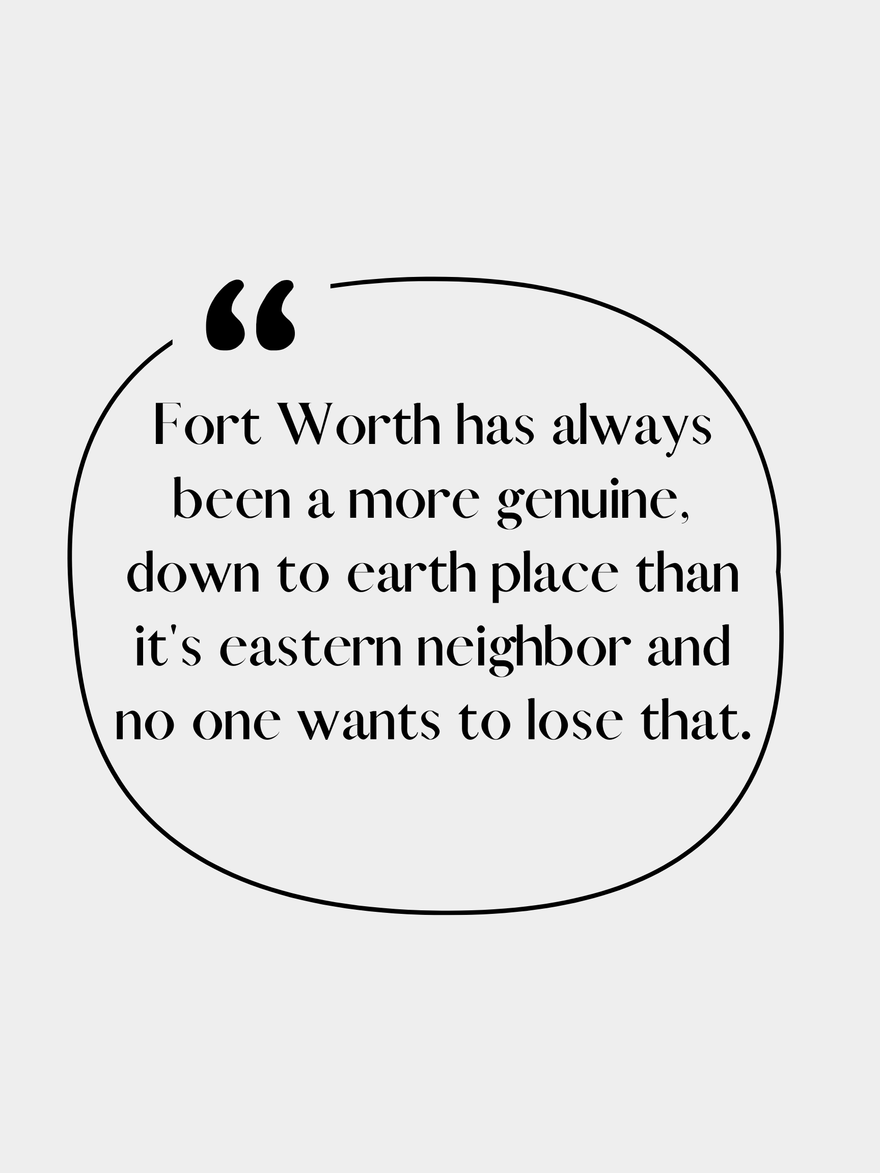 The cultural enrichment and small-town experience that is gained from Fort Worth will be void with continued large-scale developments, making it just another big production city.